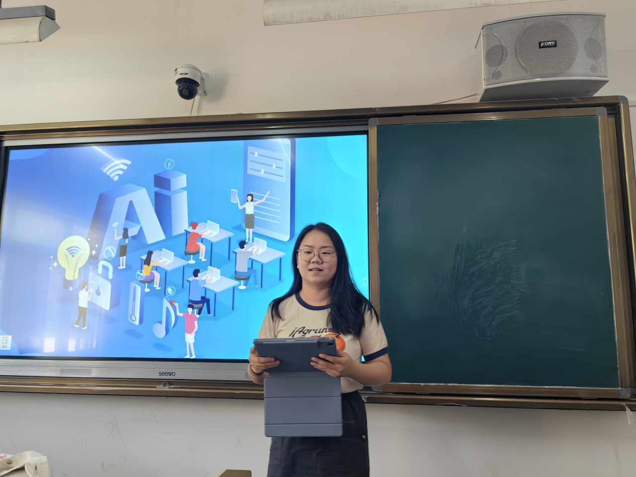 西班牙语系教师杨茜分享了她在教学中,如何将各种先进的教学设备进行最大化利用,利用各种教学手段,设置课堂互动,提高课堂参与度,同时指导学生利用丰富的网络资源及AI技术,开展自主探究式学习。