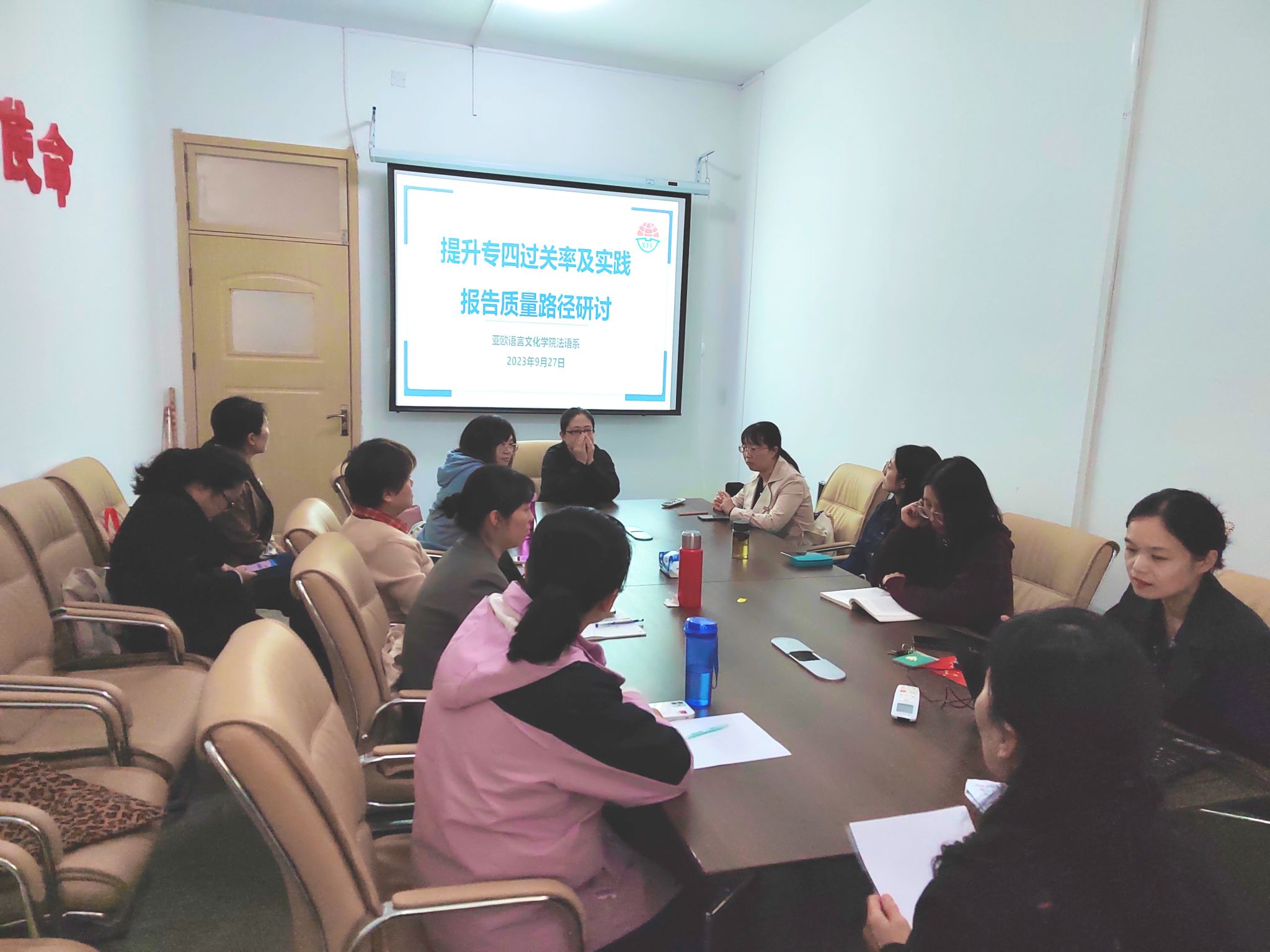 9月27日下午,亚欧语言文化学院法语系在3109召开本学期第四次教研会议,本次教研会议有两个议题:一是提升专四过关率路径研讨,二是提升实践报告质量路径研讨。法语专业全体教师参会,法语系主任王姗姗主持会议。