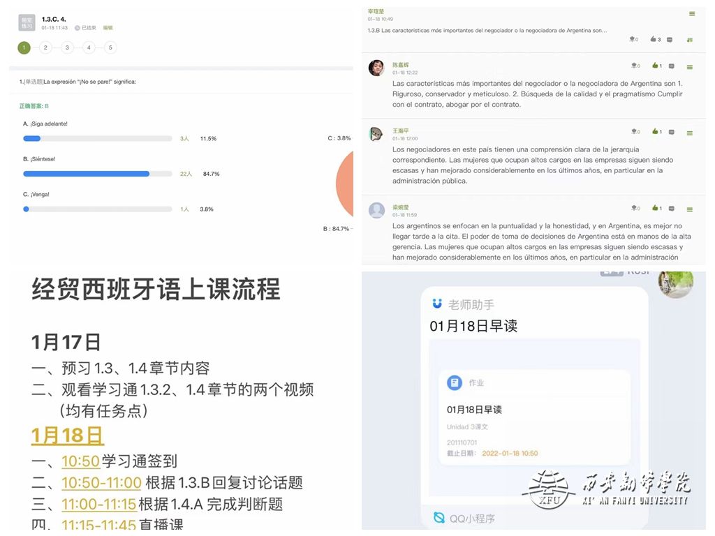 近日,亚欧语言文化学院西班牙语专业课程第二周线上教学圆满结束。在总结前期授课过程中遇到的问题的基础上,西班牙语教研室各专业老师本周继续整合课程资源、灵活调整教学方案,采取将部分学习任务安排至课前,以录播+练习+直播答疑等方式开展线上教学,亮点突出,效果显著。