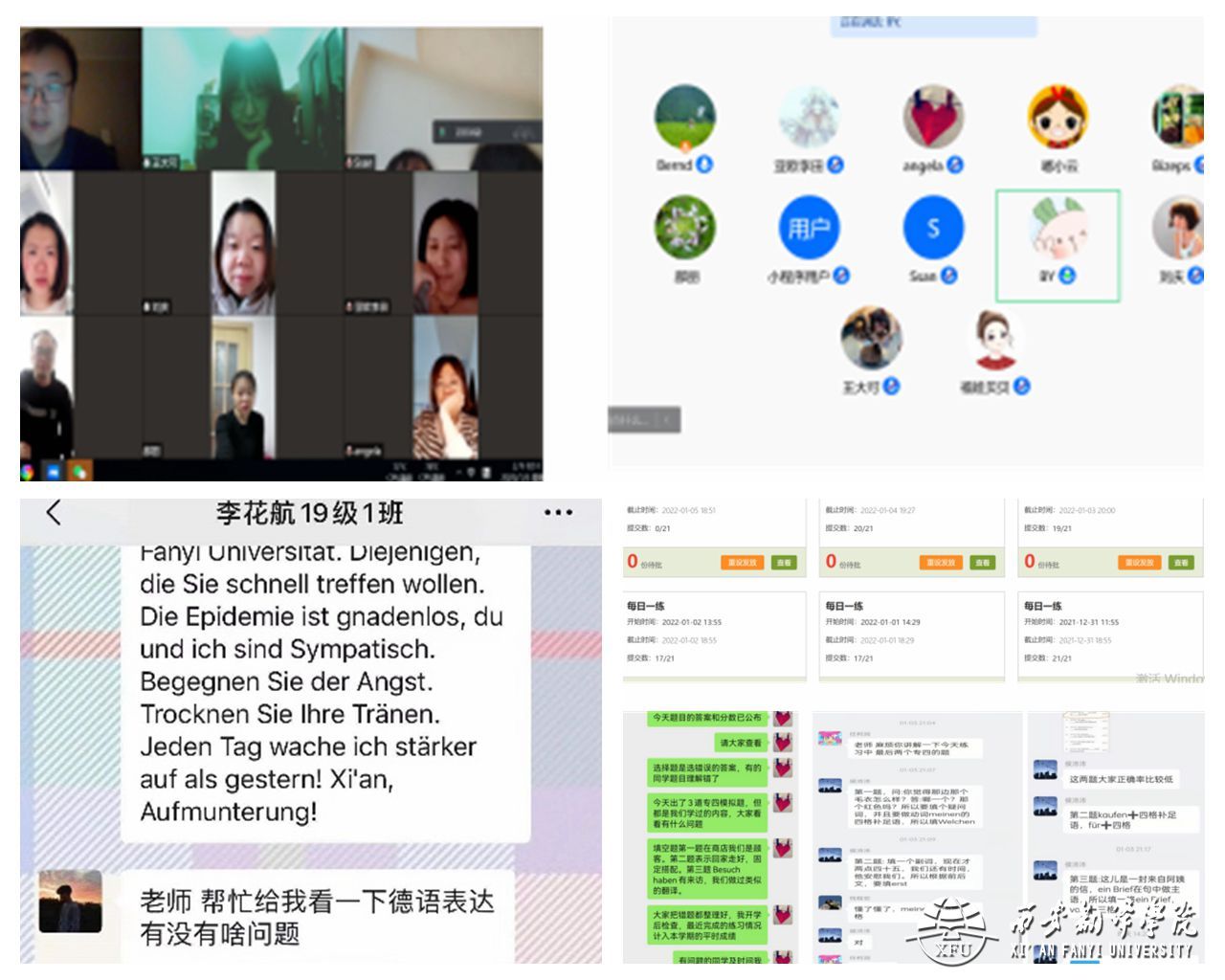 在西安疫情肆虐的形势下,为响应我校“停课不停学”号召,亚欧语言文化学院德语系全体教师于近日在腾讯会议平台开展“疫情背景下学生线上学习特色辅导活动”专题教研活动。德语系全体专职教师积极踊跃发言,分享了自己在学生线上辅导方面的一些特色做法。