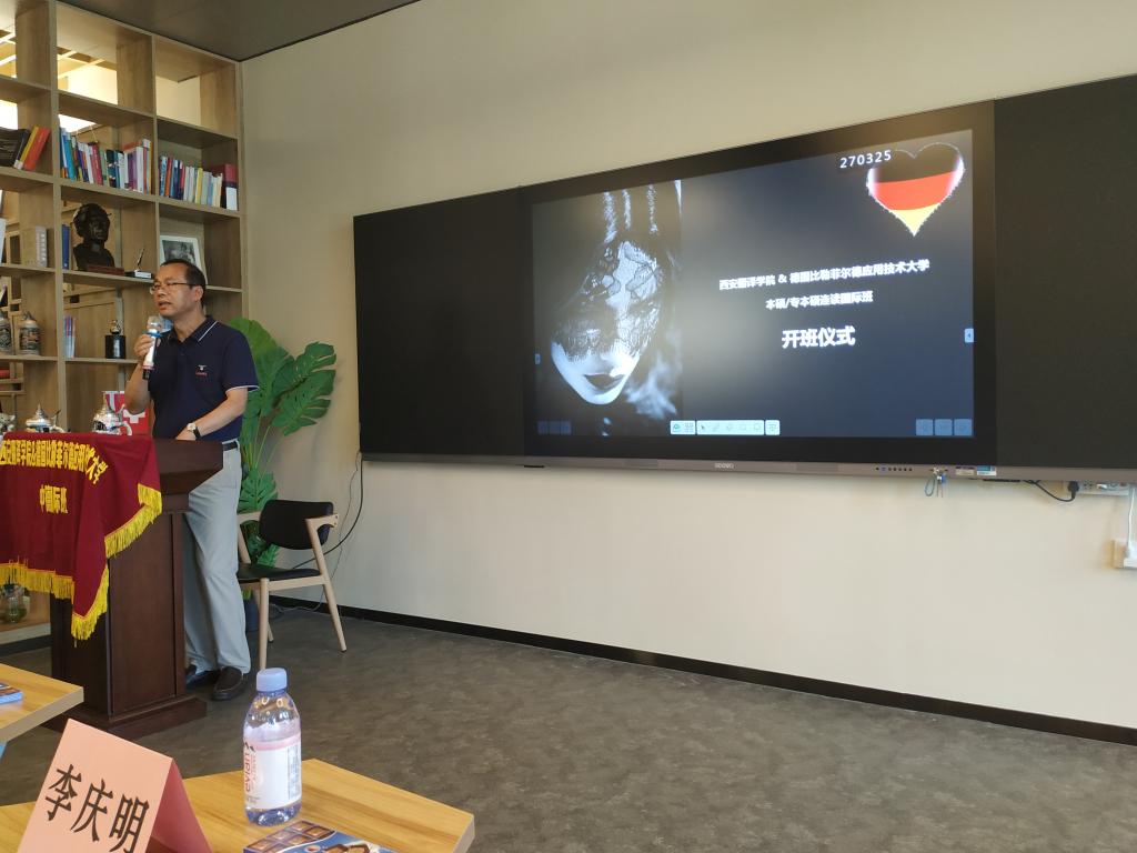 开班仪式第一项由李庆明院长讲话。他首先代表学院欢迎中德国际班学员,同时给中德国际班学员提出希望和要求:一是希望大家做有准备的人,以饱满的热情和严谨的态度积极投身学习,努力掌握德语语言知识并了解德国文化,提升德语听说读写译基本技能,为今后赴德深造乃至个人职业发展奠定坚实的基础;二是掌握科学合理的学习方法,切实提高发现问题、分析问题和解决问题的能力,培养创新精神和批判性思维,形成良好的跨文化交际意识;三是塑造正确的三观,做一名合格的中德文化传播者。