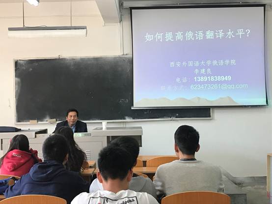 在“一带一路”丝绸之路的大背景下,俄语翻译将发挥着至关重要的作用,为了让同学们能够找准定位,4月26日下午,我校亚欧语言文化学院在3222教室开展讲座,本次讲座邀请到西安外国语大学副教授,硕士研究生导师,全国俄语同声传译译员李建良教授担任主讲。