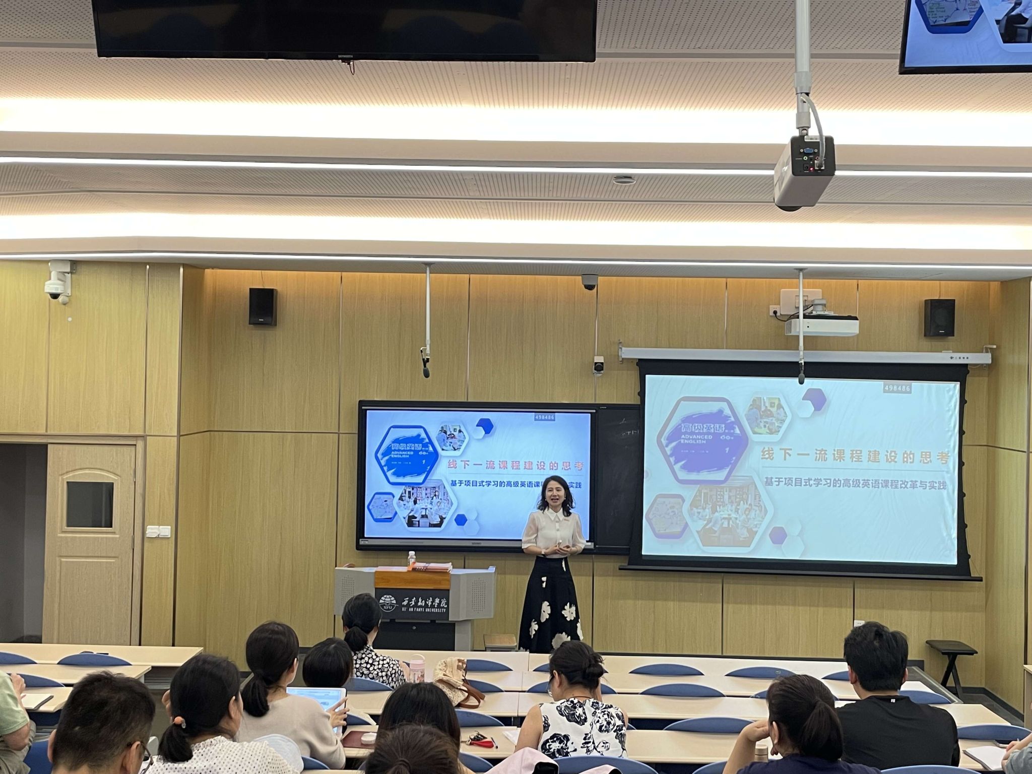 7月12日上午,亚欧语言文化学院邀请教务处处长秦晓梅作题为“线下一流课程建设的思考——基于项目式学习的高级英语课程改革与实践”讲座。亚欧语言文化学院全体教师参加讲座,学院副院长吴震主持讲座。