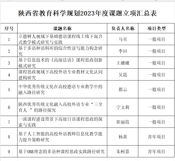 今日,陕西省教育科学规划领导小组办公室公布了“陕西省教育科学规划2023年度课题”立项名单,伟德官网吴震、崔丽霞、李田、马贝、都云、王姗姗、宁文莉、朱柯嘉、杨茜9位老师获批立项。