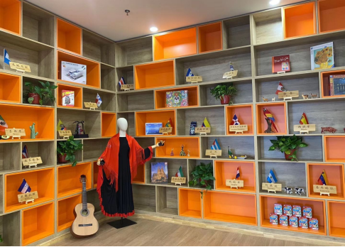 展示区以展柜为平台,通过对西班牙语国家和地区历史、文化及特色的展示,让学生近距离接触和领略西语国家的风采。配合《西班牙语国家概况》和《拉丁美洲文化概况》等相关课程,增强学生的参与度和兴趣感,提高授课质量。