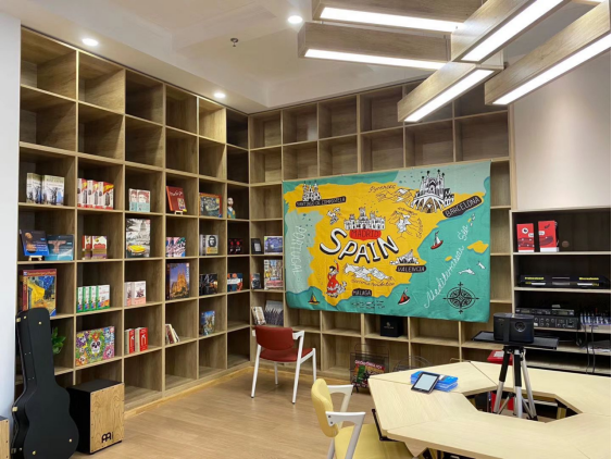 体验区通过音频、视频及书籍资源给学生提供一个对西语文化的深度“沉浸式”体验氛围。配置了中央操控台、投影仪、幕布、话筒等智能感官体验设备,让学生能够多感官、全方位的感知语言的文化魅力;设置了西班牙美食文化和特色乐器体验,让学生可以动手制作西班牙美食和展示音乐天赋。