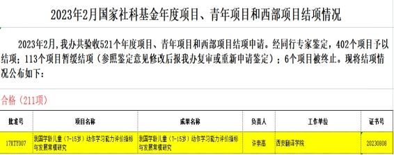 近日,全国哲学社会科学工作办公室公布了2023年2月国家社科基金项目结项结果,共提交521个项目结项申请,402个项目予以结项,113个项目暂缓结项,6个项目被终止。其中我校体育学院许崇高教授主持的《我国学龄儿童(7-15岁)动作学习能力评价指标与发展常模研究》项目(17XTY007),顺利结项。
