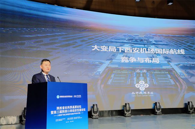 西部机场集团副总经理汤涛作《大变局下西安机场国际航线竞争与布局》主旨发言