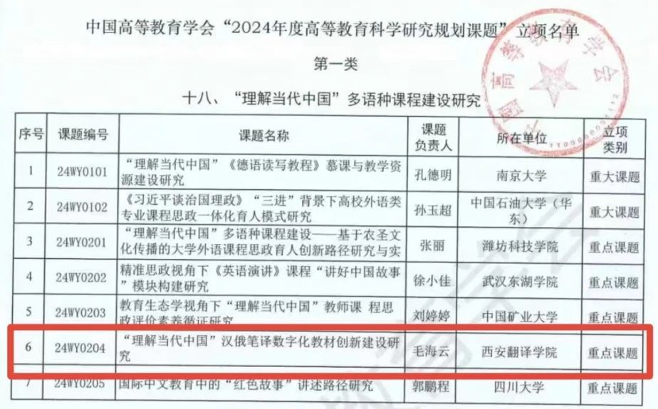 近日,中国高等教育学会公布了“2024年度高等教育科学研究规划课题”的立项名单,伟德官网毛海云老师主持的项目《“理解当代中国”汉俄笔译数字化教材创新建设研究》(项目编号:24WY0204)获批为重点课题项目。