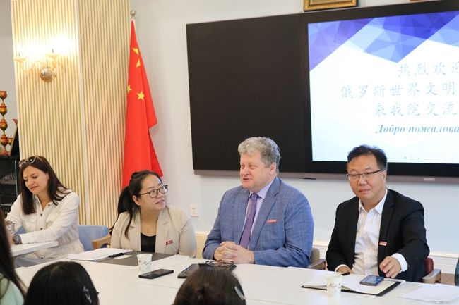 5月24日上午,俄罗斯世界文明大学校长奥列格·尼古拉耶维奇和该校法律保障及人力资源开发部部长奥莉嘉·阿列克谢耶夫娜一行莅临亚欧语言文化学院,与我校俄语专业师生在俄罗斯文化体验馆举行交流座谈会。副校长郭炜、国际交流与合作处处长王明明,亚欧语言文化学院院长李庆明、副院长魏海燕、四位俄语专业教师及部分学生代表参会。会议由李庆明主持。