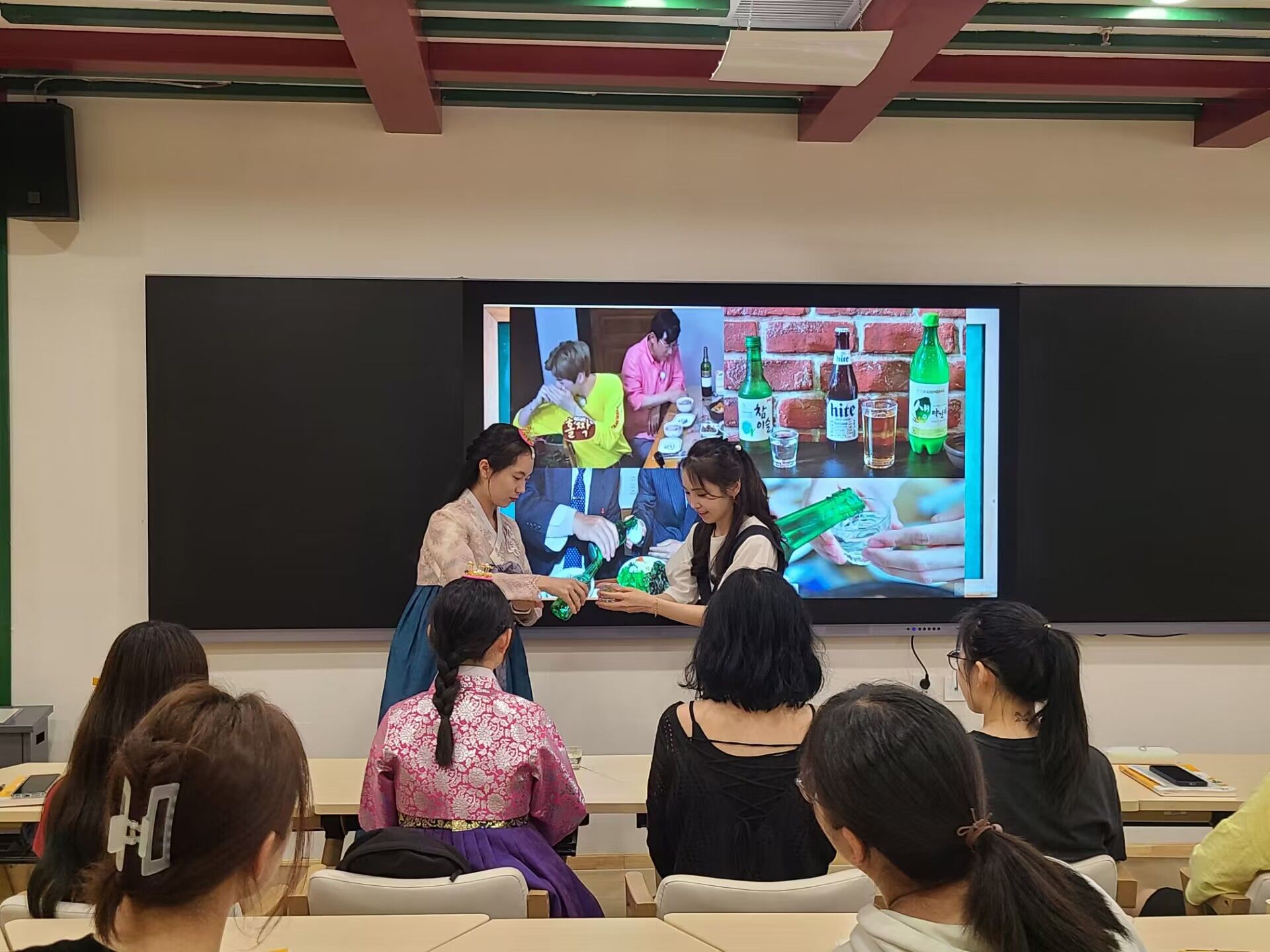6月9日,亚欧语言文化学院朝鲜语专业外教李惠真在韩国文化体验馆内进行韩国传统文化讲座。朝鲜语专业老师邹俊秀、王博、秦广兰、袁敏及部分学生代表参加讲座。