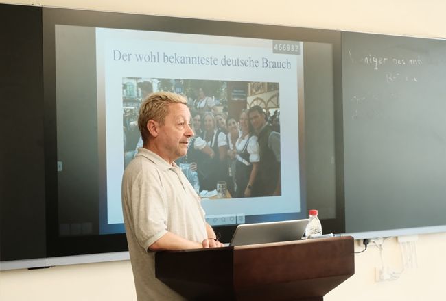 6月12日下午,亚欧语言文化学院德语系外籍专家Dirk Werner Hartmann在德国文化体验馆为德语系师生作题为“不为人知的德国习俗”主题讲座。