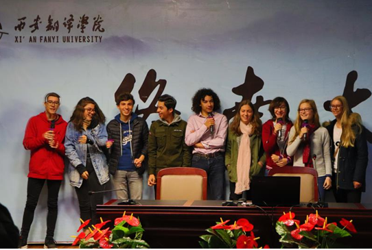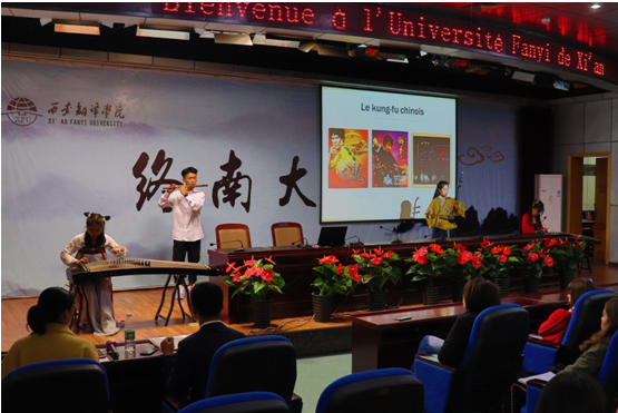 2018年10月23日上午,法国学生代表团到我校参观交流,受到了我校师生们的热情欢迎。在亚欧语言文化学院法语系教师和学生代表的带领下,代表团参观了我校图书馆、科技楼等校园建筑。在终南大讲堂,我校学生不但介绍了我国的古典文化、美食文化和现代生活方式,还带来了长笛、古筝、二胡、魔术等表演,他们的介绍和表演充分展现了西译学子积极向上、生气勃勃的精神面貌。最后代表团还体验了书法、国画、剪纸等我国优秀传统文化艺术,并与我校学生在东区体育馆进行乒乓球、羽毛球、武术、篮球等体育娱乐互动。中、法两国学生个个笑容满面,收获颇丰。