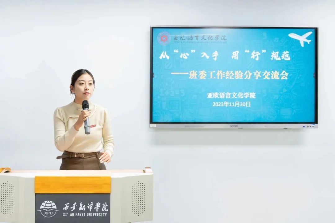 为加强学风建设,树立良好班风,助力2023级新任班委更好地服务与管理班集体,11月30日,亚欧语言文化学院开展“从‘心’入手,用‘行’规范”班委工作经验分享交流会。辅导员黄仁秀迪、2022级优秀班委代表以及2023级班委代表到场参加。会议由刘杨杨主持。