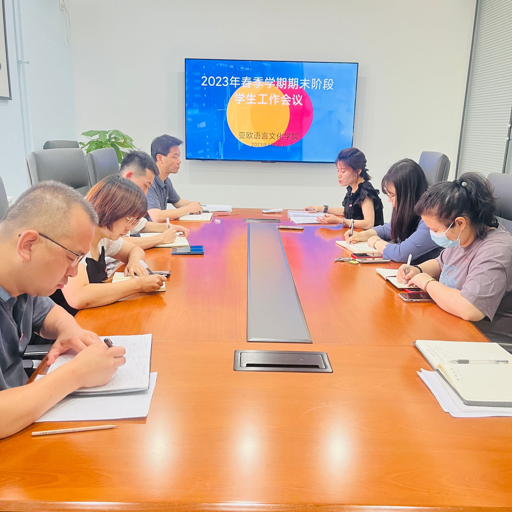 为落实学校期末考试阶段学生工作安排,圆满完成本学期工作任务,6月14日上午,亚欧语言文化学院在三号教学楼召开2023年春季学期期末阶段学生工作会议,学院党委书记、副院长宇文永康,学工办主任尹娜,团总支书记陈福礼及全体辅导员参会。