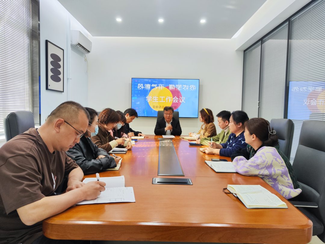 郭炜作总结讲话。他要求学院根据学校工作会议的要求和学院学生的特色,制定出有利于培养高素质外语人才的学生工作方案,切实推进学风建设,帮助学生提升专业水平和技能,促进学院高质量就业。同时,辅导员是学生工作的执行者,学院在推进学生工作的同时,也要关注辅导员的发展,打造一支高素质、能力强、作风硬的辅导员队伍,促进学生工作有效落实。