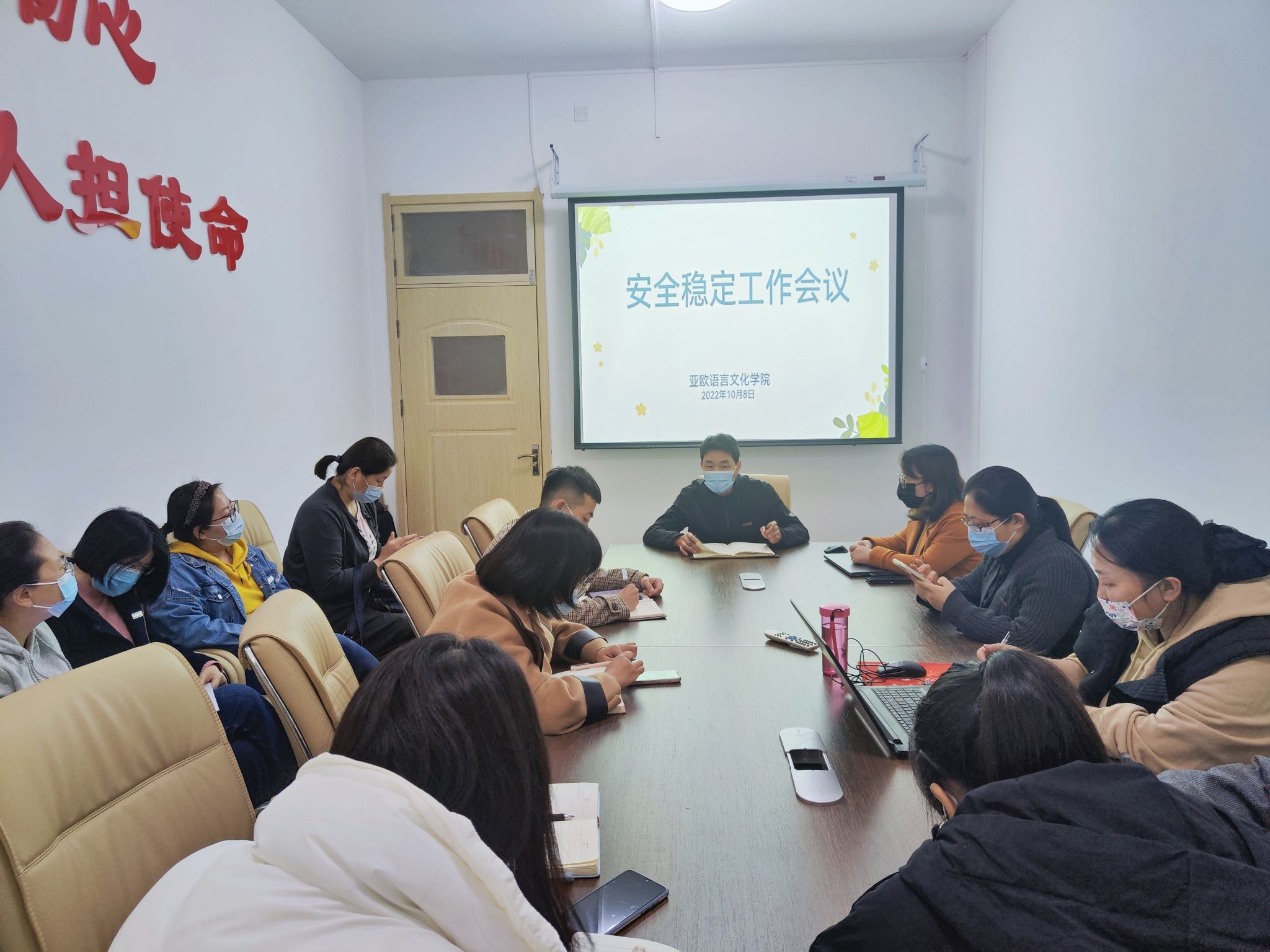 为进一步强化校园安全稳定工作的重要性,维护好校园安全稳定,2022年10月8日,亚欧语言文化学院召开了安全稳定工作会议,本次会议由学院党委书记、行政副院长宇文永康主持,学院各系教师代表和全体学工人员参会。