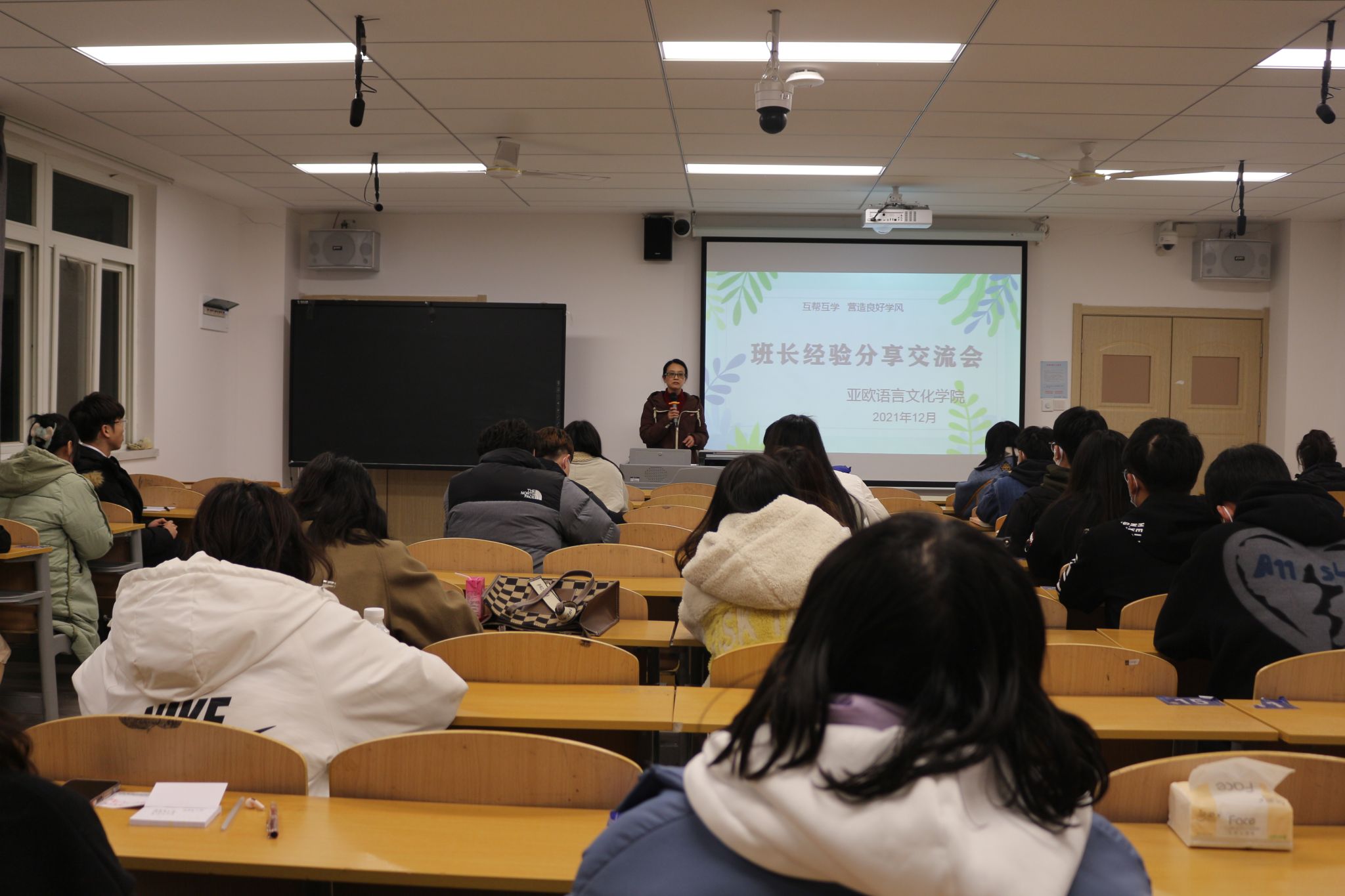 为进一步推动学院学风建设工作,强化和完善班级建设和班级管理制度,增强学生干部工作效率及综合素质,12月6日晚,亚欧语言文化学院召开了“互帮互学,营造良好学风”为主题的班长经验分享交流会。亚欧语言文化学院行政副院长卫军茹,20级、21级辅导员及各班班长参加了此次会议。会议由学工办主任尹娜主持。