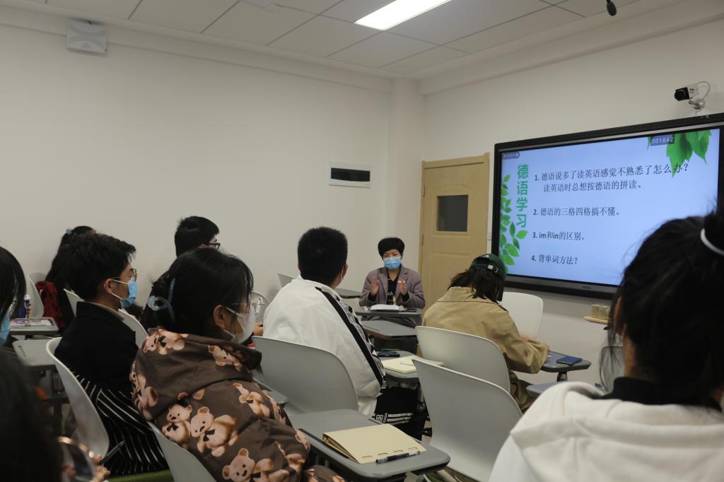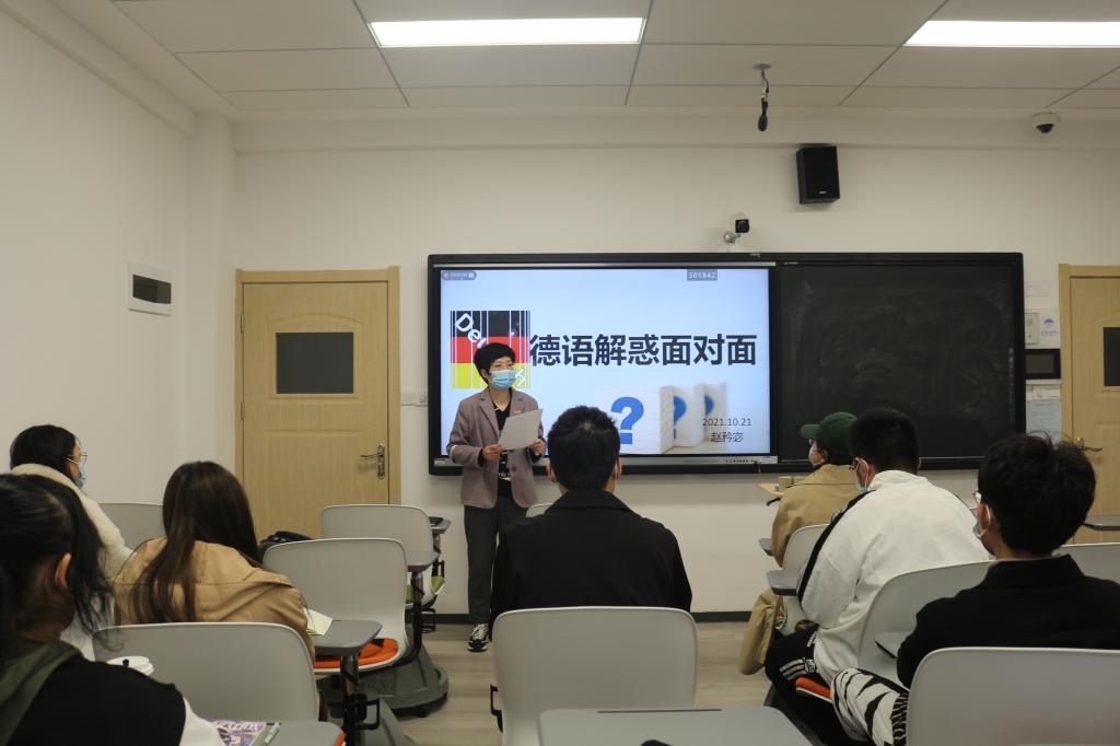 赵矜宓利用自己的专业知识及赴德学习实践经验,从德语专业的学习方法、考研方向以及就业三个方面,为学生作了详细的指导和解答。座谈会上,她热情分享了自己的学习方法,如单词联想记忆法;她还倡导同学们多渠道寻找资源,利用良好的学习条件,由浅入深,循序渐进,打下扎实的专业基础。之后,赵矜宓为同学们解读了德语专业考研的相关内容,并为大家介绍了可以选择的院校及考研对口的具体专业及科目。随后,她就目前德语专业毕业生就业实际情况,为同学们讲解了德语专业的就业方向,如翻译、跨境电商、教师等职业。她鼓励同学们,在校期间不仅要练就扎实的专业功底,还要通过参加各类考试、比赛以及实习实践,提高个人核心竞争力。最后,赵矜宓为同学们分享了自己的学习及德国留学经历。她指出,学生时代是培养一个人计划、守时、独立、诚信品格的最佳时期,希望大家能够勤勉学习,不负青春。