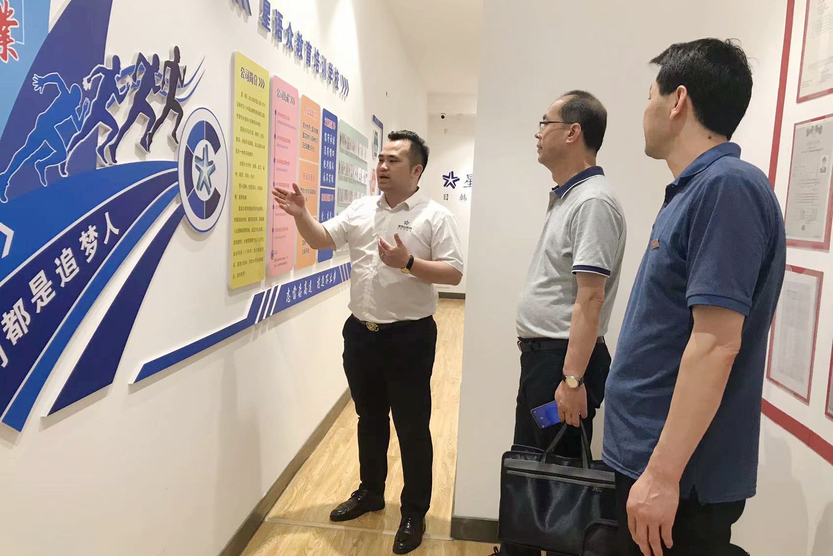 星语众教育西安分校常务副校长张方荣对我校到访人员表示欢迎,随后带领李庆明一行参观了星语众(西安)分校,对星语众教育的发展历程、教学环境与师资、人才培养体系、薪资与福利、晋升空间与发展等做了详细介绍。该校是融商务与考级为一体的面向日、韩、法、德、西小语种专业教育与培训的机构,为广大小语种专业学生提供了实习实践及工作岗位。