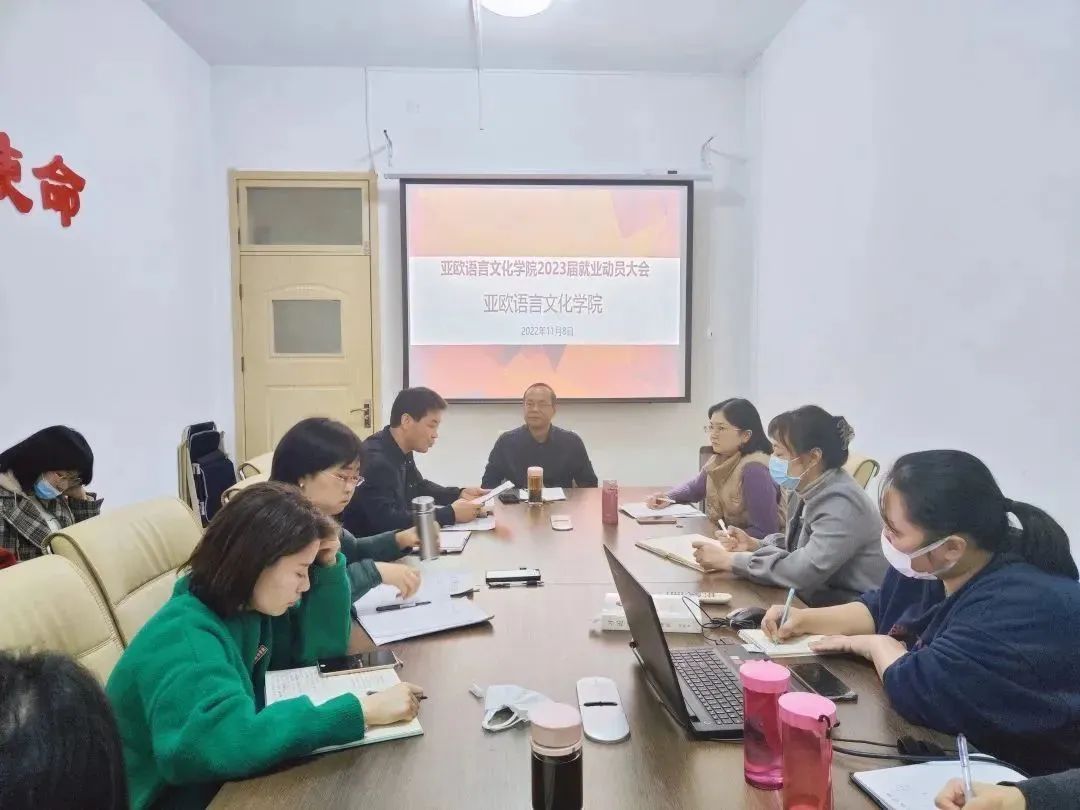 为推进2023届毕业生就业工作,提高就业质量,2022年11月8日下午,亚欧语言文化学院在3号楼一层会议室召开2023届毕业生就业动员大会。参与会议的有:亚欧语言文化学院院长李庆明,学院党委书记、行政副院长宇文永康,副院长吴震及各系办主任,以及毕业班辅导员。