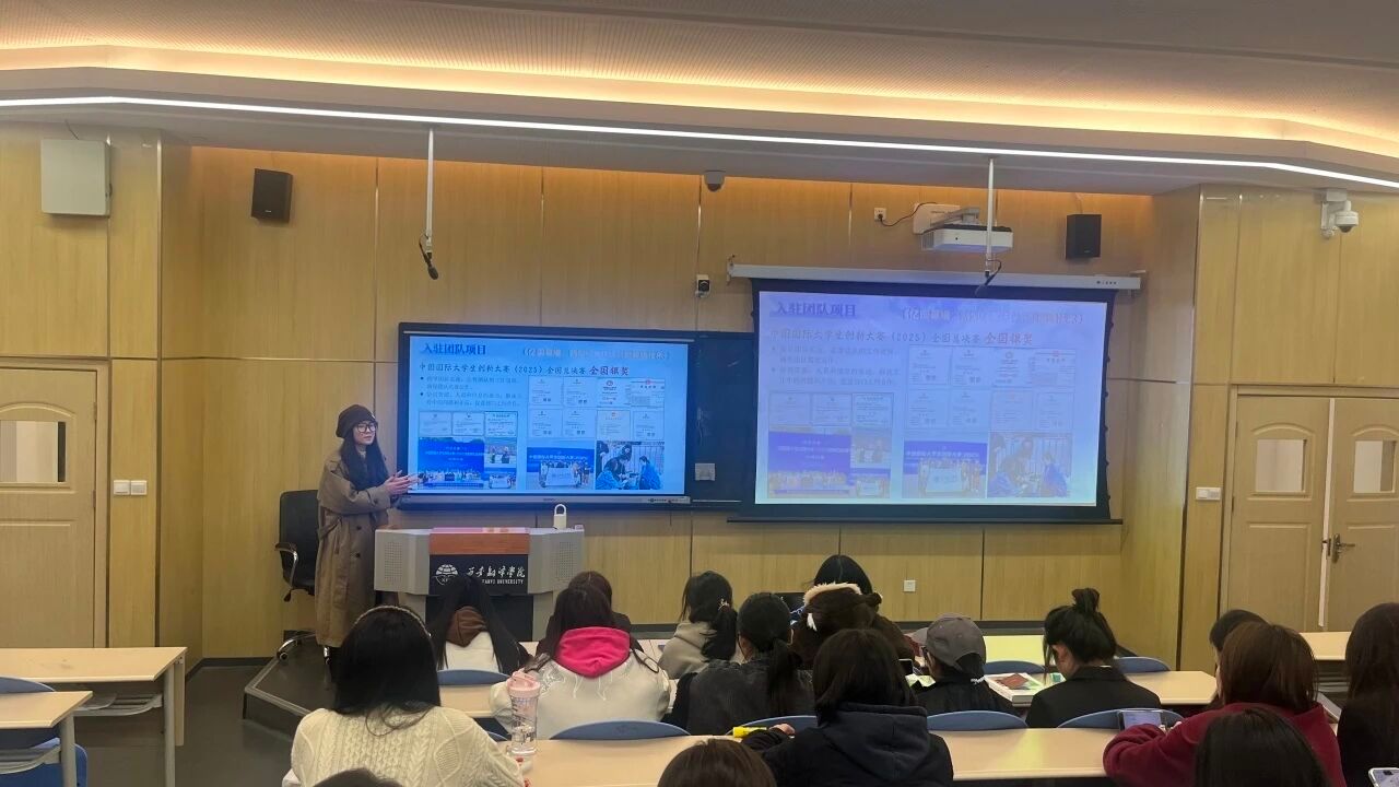 白馨怡结合自身经历,详细解读了创业管理专业的特色与优势,并通过分享孵化园内涌现出的典型案例和成功故事,生动地展示了从创意到项目的完整路径。她还重点介绍了目前园区内多个优秀的入驻团队项目,涵盖了文化创意、跨境电商、新媒体运营等多个领域,充分展现了学校学子出色的创新能力和实践精神。