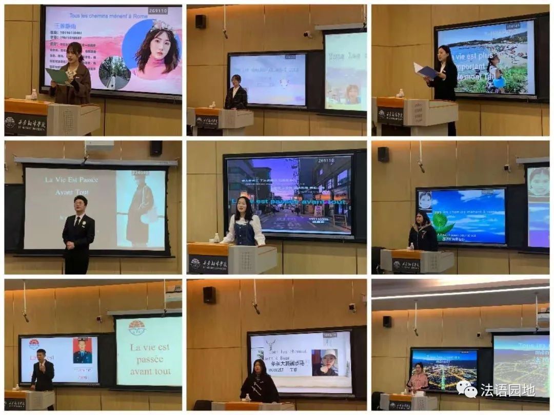 同时为了能使多位观众能够轻松愉快地观看整场比赛,更重要的是消除选手们的紧张感,特在中间穿插了才艺展示,罗仁池的尤克里里演奏《fly me to the moon》赢得了满堂喝彩;还有压轴出场的李佳美同学带来的配音秀引起了现场的掌声阵阵,活跃了整场比赛的氛围,当然还有我们其他选手带来的诗歌朗诵、法语歌曲等也都是相当精彩。