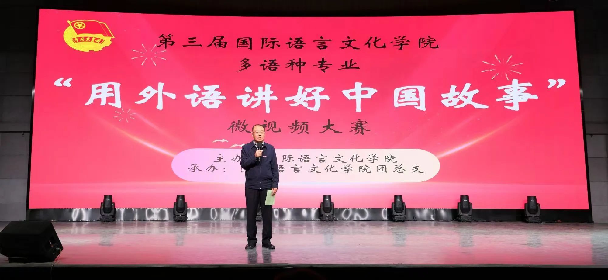 栾宏作总结讲话。他向所有参赛的同学们表达了衷心的感谢和热烈的祝贺,对同学们的付出和努力给予了高度的肯定。他表示,九部参赛作品内容丰富且主题鲜明,《航拍中国》主题作品中,以独特的视角展示了祖国的大好河山,通过镜头记录了家乡的现代化建设,展现了同学们对家乡的热爱和对祖国的自豪;《中国的年味》主题作品,让观众领略到了传统节日的魅力,感受到了外国文化与中国文化的交融。以上作品不仅展现出了同学们良好的语言水平,更体现了同学们的国民化素养和家国情怀。同学们用实际行动诠释了用外语讲好中国故事的深刻内涵,为弘扬中华优秀传统文化做出了贡献。他希望同学们能继续保持这份热情和努力,不断提高自己的专业水平和文化素养,用多语种作为桥梁,将中国故事传播到更广阔的世界,为推动中外文化交流贡献自己的力量,学校将会全力为同学们提供更广阔展示自己的平台,让更多的同学讲好西译故事,讲好陕西和中国的故事。
