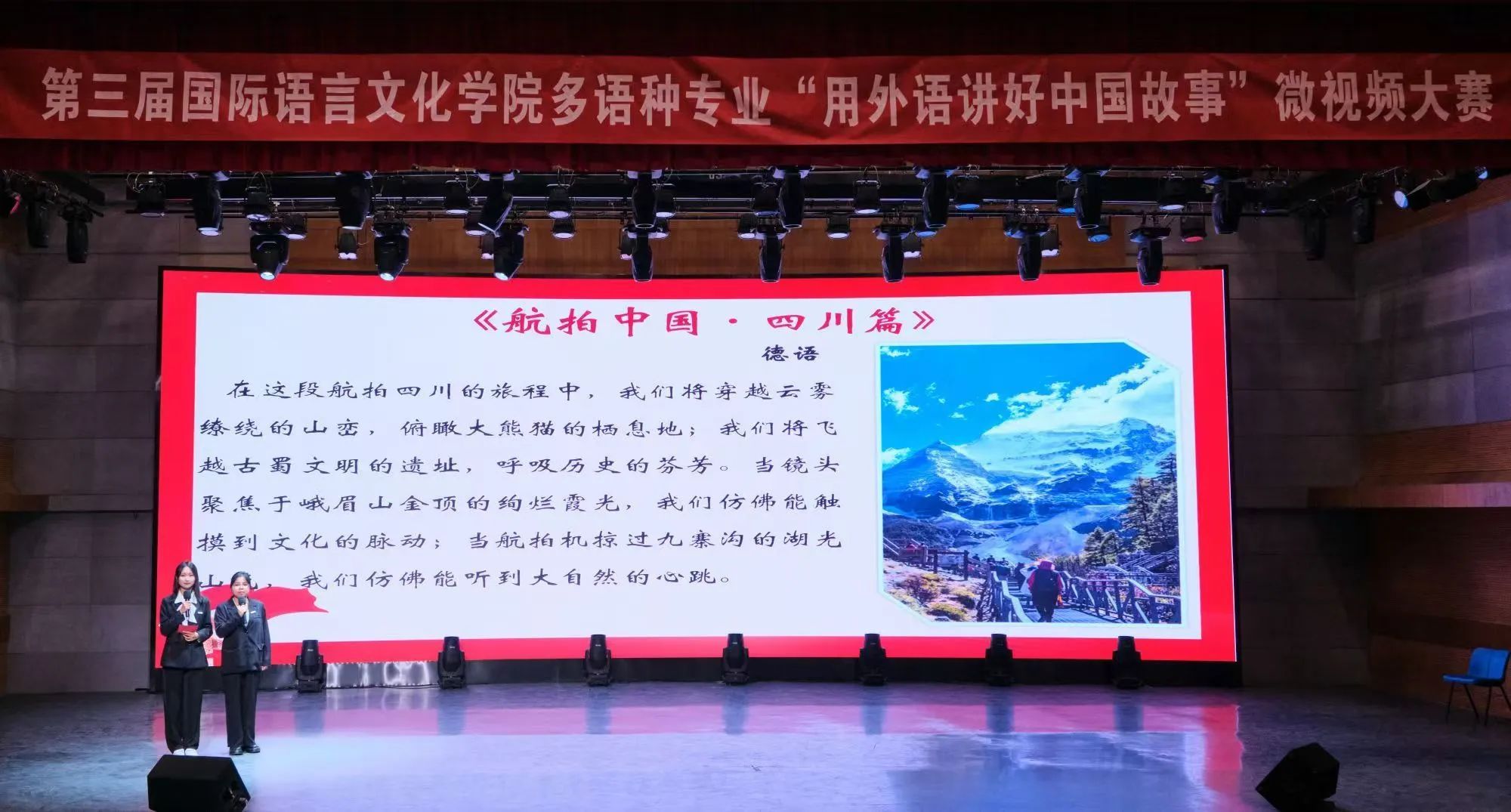 经过初赛,共有九部作品脱颖而出进入决赛。在决赛现场,参赛选手依次上台进行视频内容讲解和视频展示。德语专业大三年级学生徐宇佳通过视频《航拍中国·四川篇》,开启了视觉与心灵的盛宴,揭开天府之国那层神秘的面纱。