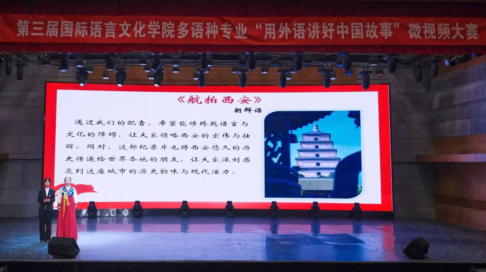 朝鲜语专业大三学生方雅琪的参赛视频主题是《航拍西安》,通过他们的配音,旨在能够跨越语言与文化的障碍,让大家领略到西安的宏伟与壮丽。