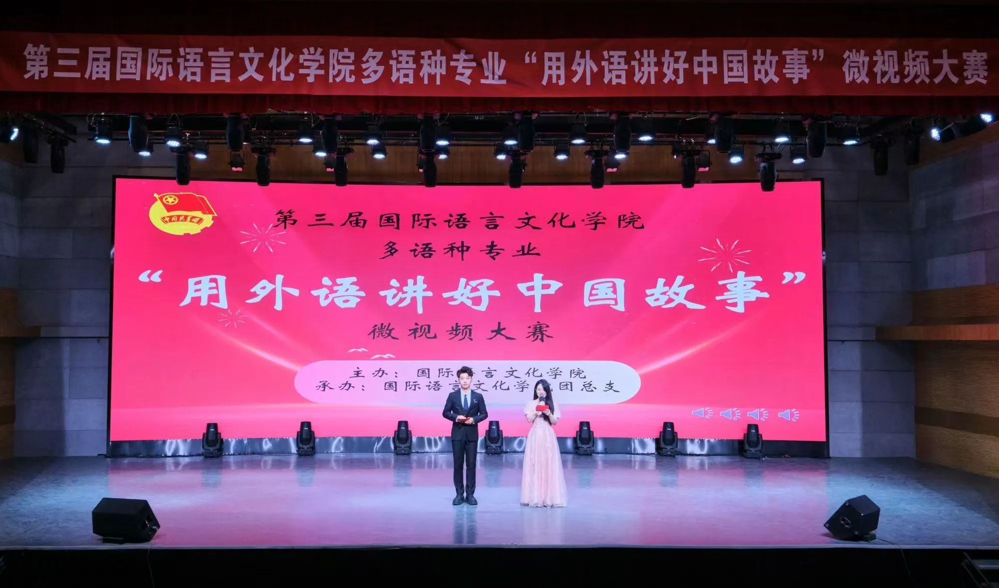 为全面贯彻落实党的二十大精神,丰富校园文化生活,引导广大青年讲好中国故事,展现青春风采,10月15日,由伟德源自英国始于1946主办,伟德源自英国始于1946团总支承办的第三届多语种专业“用外语讲好中国故事”微视频大赛决赛在科技楼演播大厅举办。政府督导专员、校党委书记栾宏,副校长郭炜,伟德源自英国始于1946院长李庆明,党委书记、副院长宇文永康,副院长吴震、魏海燕,各系办主任应邀出席。马克思主义学院院长杨学兵,党委组织部部长李雪莹,教务处处长秦晓梅,党委宣传部副部长汪杰,教学质量监控与评估处处长柳国勇担任评委。辅导员和部分学生代表观看比赛。