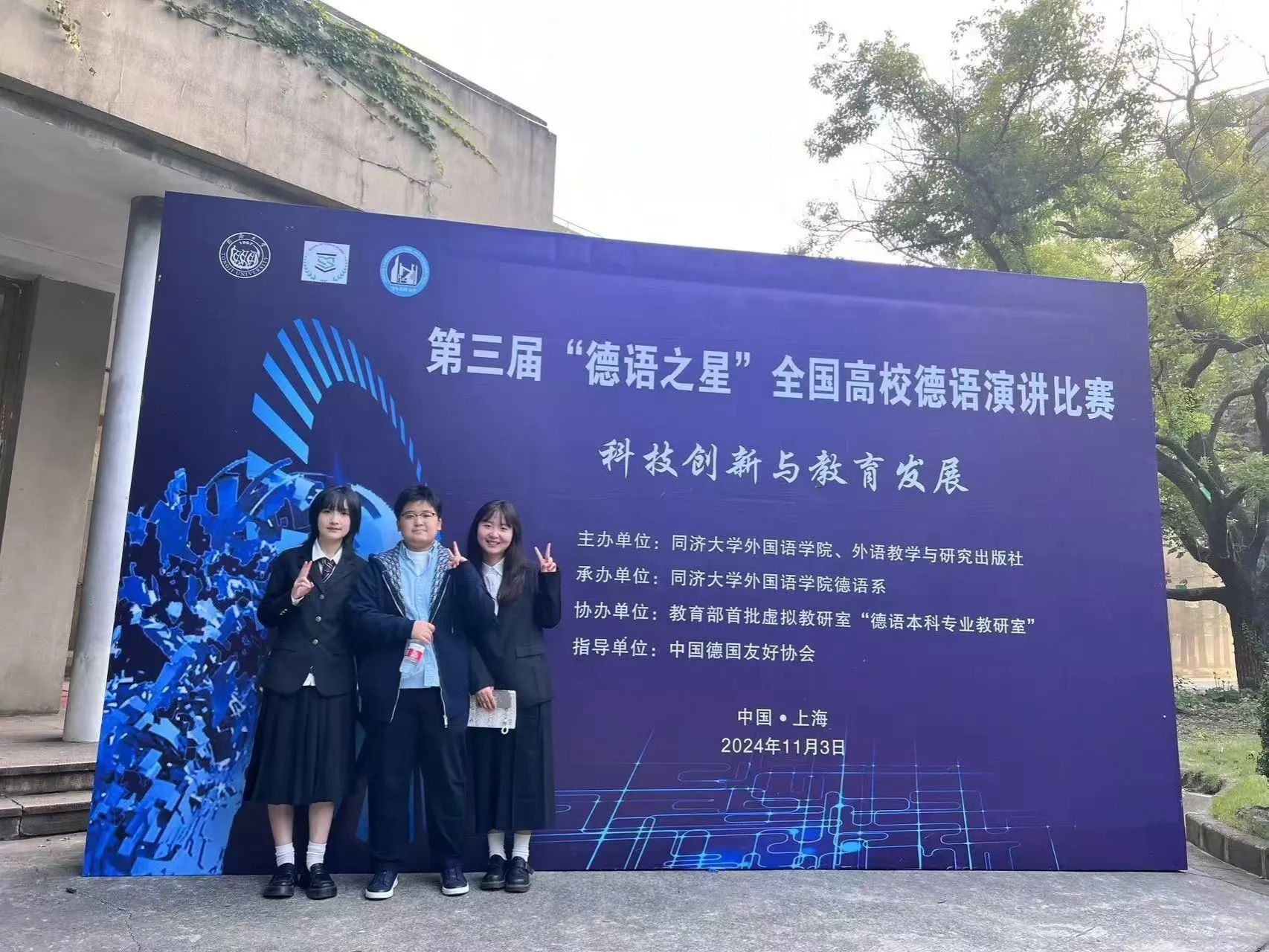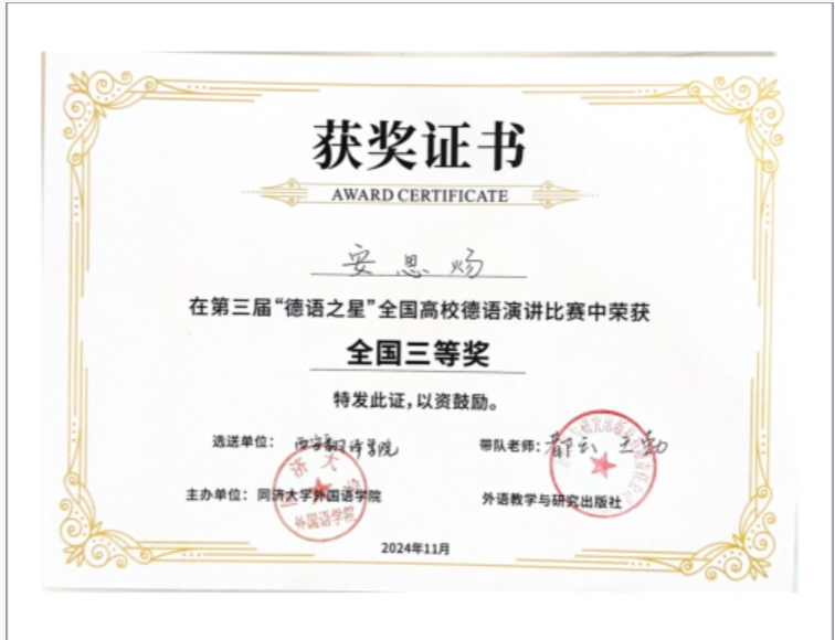 11月3日,由同济大学外国语学院和外语教学与研究出版社联合主办,同济大学外国语学院德语系承办,教育部首批虚拟教研室“德语本科专业教研室”协办,中国德国友好协会指导的第三届“德语之星”全国高校德语演讲比赛决赛在经历一上午的紧张比赛后顺利结束。伟德源自英国始于1946德语系学生安思炀、张欣蕾和赵亚轩在激烈竞争中脱颖而出,与北京大学、北京外国语大学等15支来自“985”和“211”高校的队伍同台竞技,最终荣获本次比赛的三等奖。此次比赛的结果充分展现了我校德语学子出色的德语演讲能力和文化素养。