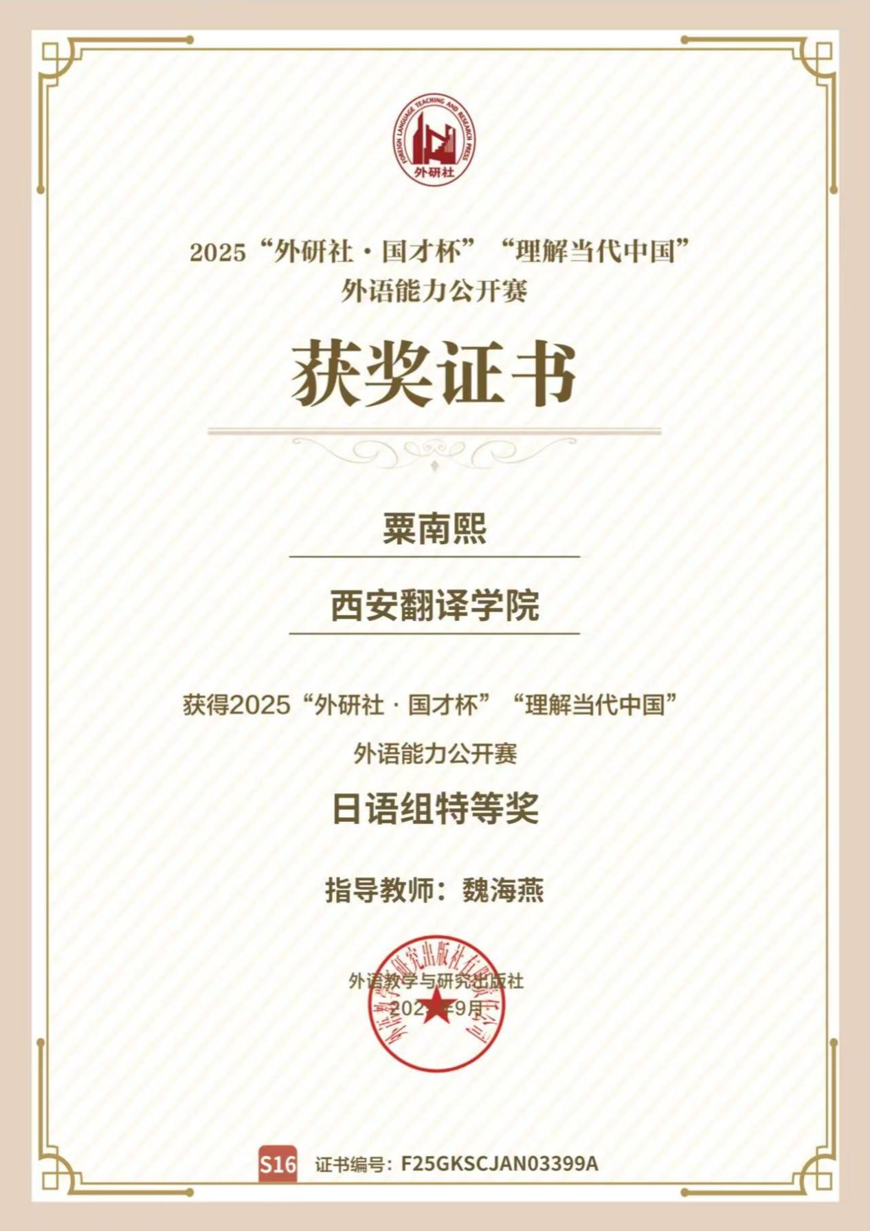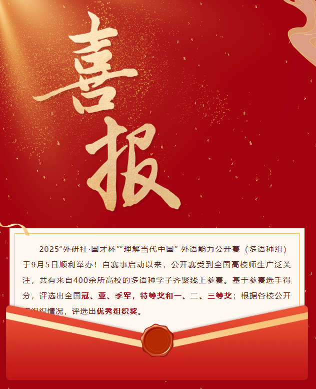 2025年9月5日“外研社·国才杯”“理解当代中国”外语能力公开赛(多语种组)圆满落下帷幕。此次大赛吸引了来自全国400余所高校的多语种精英学子云端竞技,共展外语风采与时代理解深度,我校日语专业学子粟南熙在这场激烈角逐中脱颖而出,斩获佳绩。