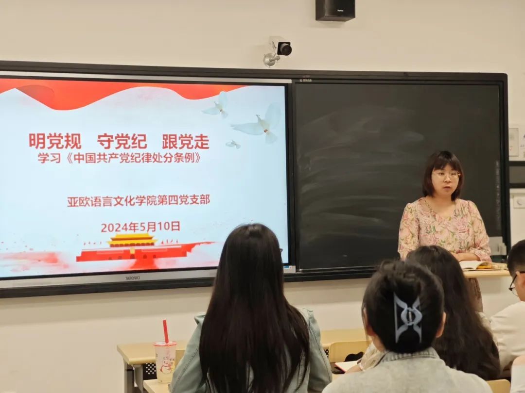 为牢固树立全体党员党章党规党纪意识,自觉做到守纪律、讲规矩、知敬畏、存戒惧,发挥党员先锋模范作用,5月10日,亚欧语言文化学院第四党支部召开“明党规、守党纪、跟党走”——《中国共产党纪律处分条例》专题学习会议,全体党员参会。