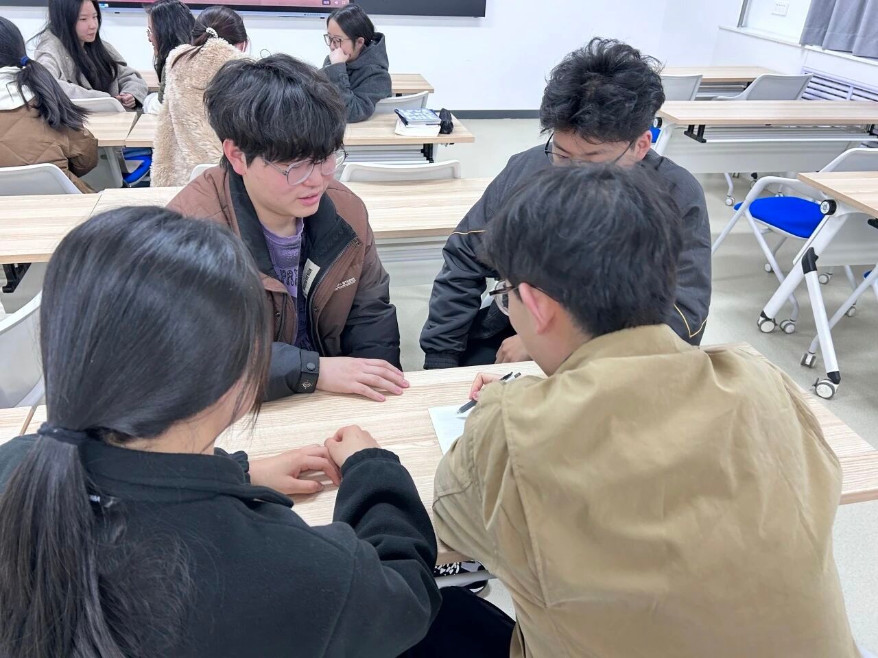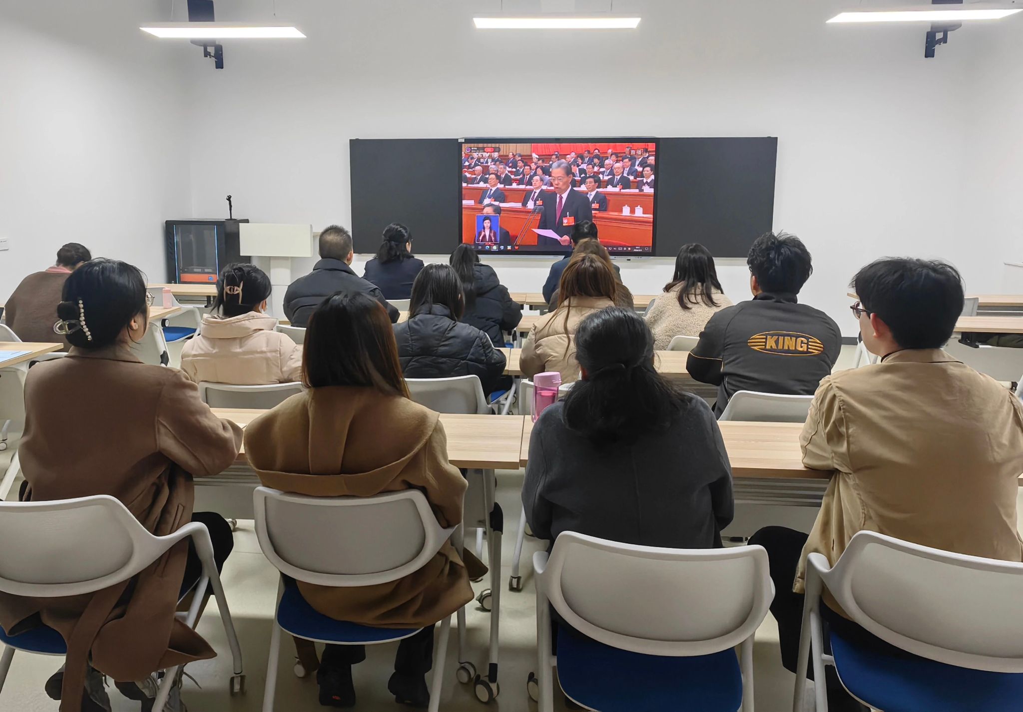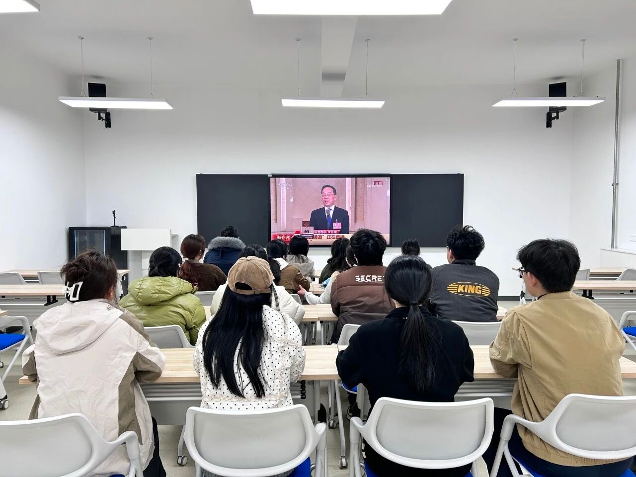 收看过程中,师生们认真记录报告要点。大家一致认为,今年的政府工作报告全面回顾了过去一年的辉煌成就,科学擘画了“十五五”时期的发展蓝图,特别是报告中关于教育强国、文化自信、高水平对外开放等内容,与学院外语教学、国际传播等专业特色高度契合,令人倍感振奋。