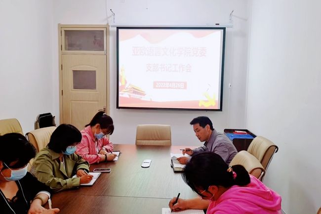 为贯彻落实校党委2022年最新工作要点,充分发挥基层党组织战斗堡垒和先锋模范作用,4月26日,亚欧语言文化学院党委召开支部书记工作会。会议由学院党委书记宇文永康主持,支部书记杨淦、刘珊、蒋敏、黄丽娜参加会议。