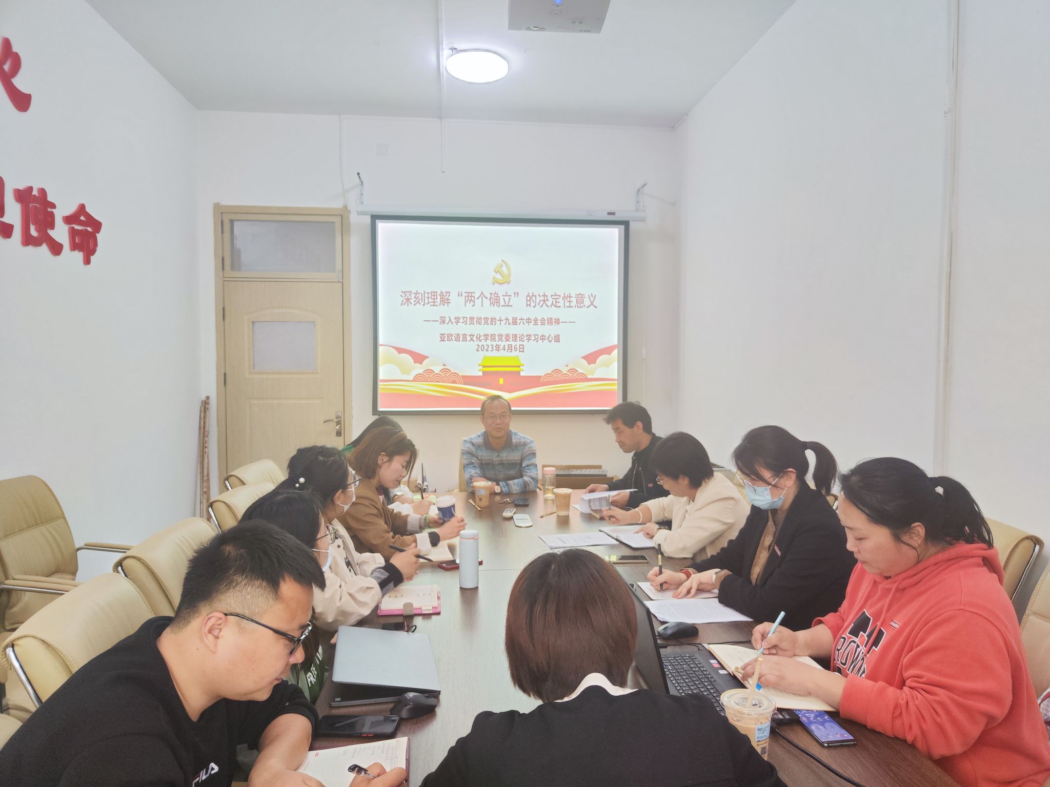4月6日下午,亚欧语言文化学院党委理论学习中心组(扩大)召开了理论学习会议,会议由亚欧语言文化学院党委副书记宇文永康主持,亚欧语言文化学院院长李庆明、教学副院长吴震、魏海燕、党委委员张青丽、陈福礼、刘珊,各党支部书记及各教研室负责人参会。