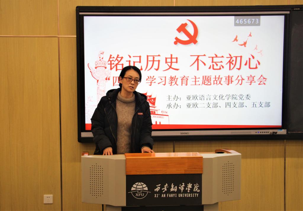 11月18日下午,亚欧语言文化学院党委在4109T教室举办铭记历史,不忘初心——“四史”学习教育主题故事分享会。亚欧语言文化学院党委书记卫军茹,学工办主任尹娜,各支部书记、各支部宣传、组织委员们,以及各支部学生党员参加本次分享会。