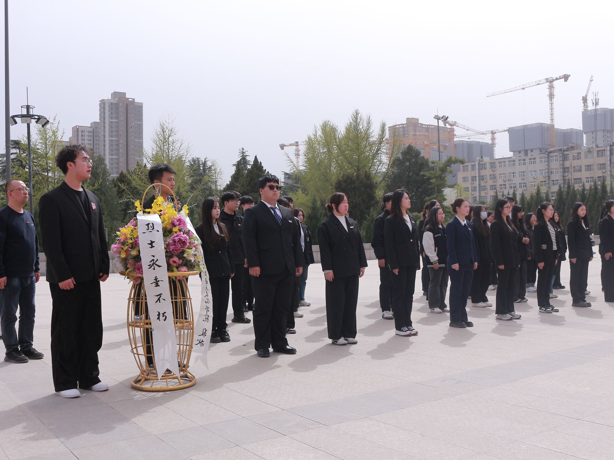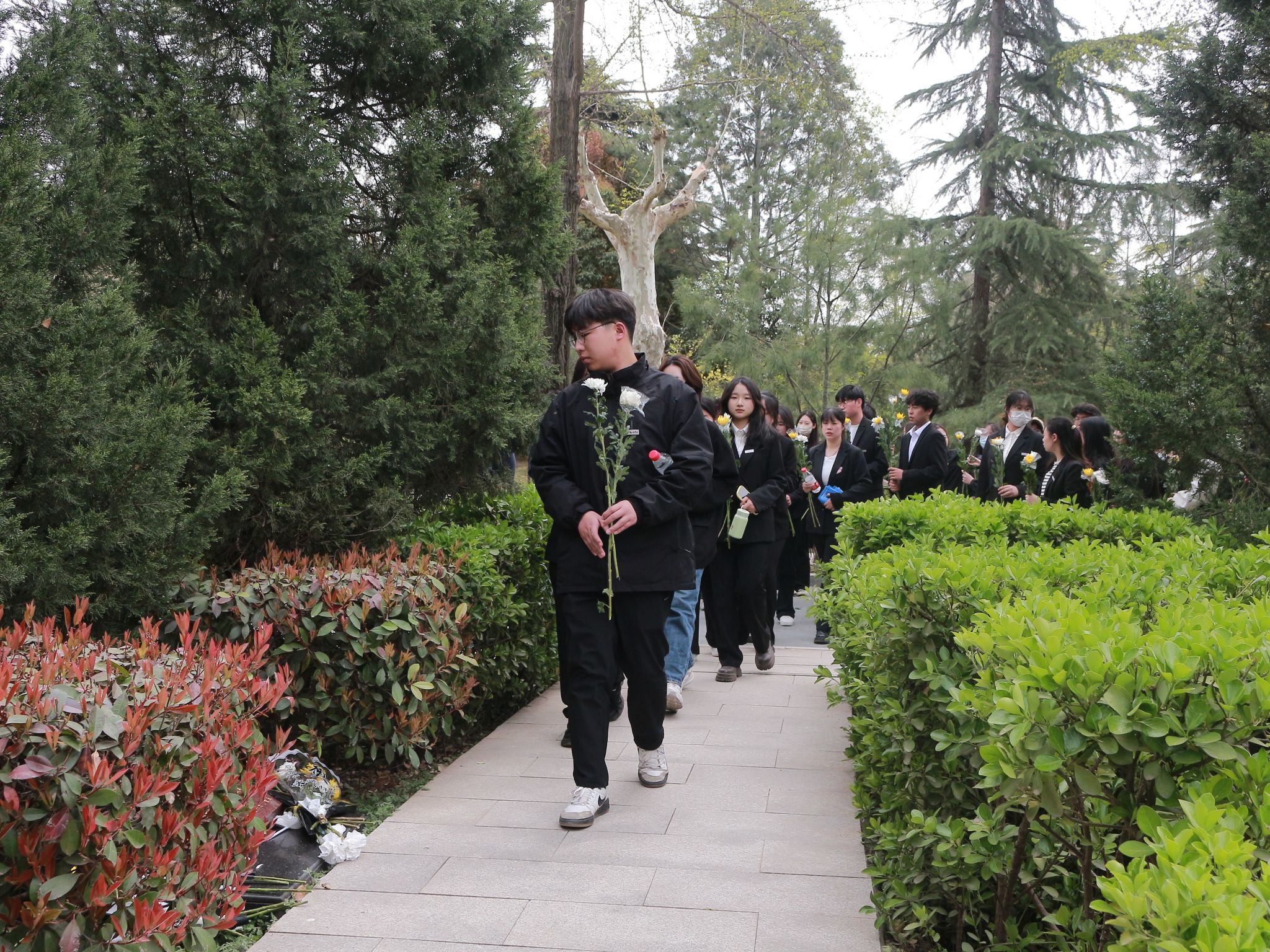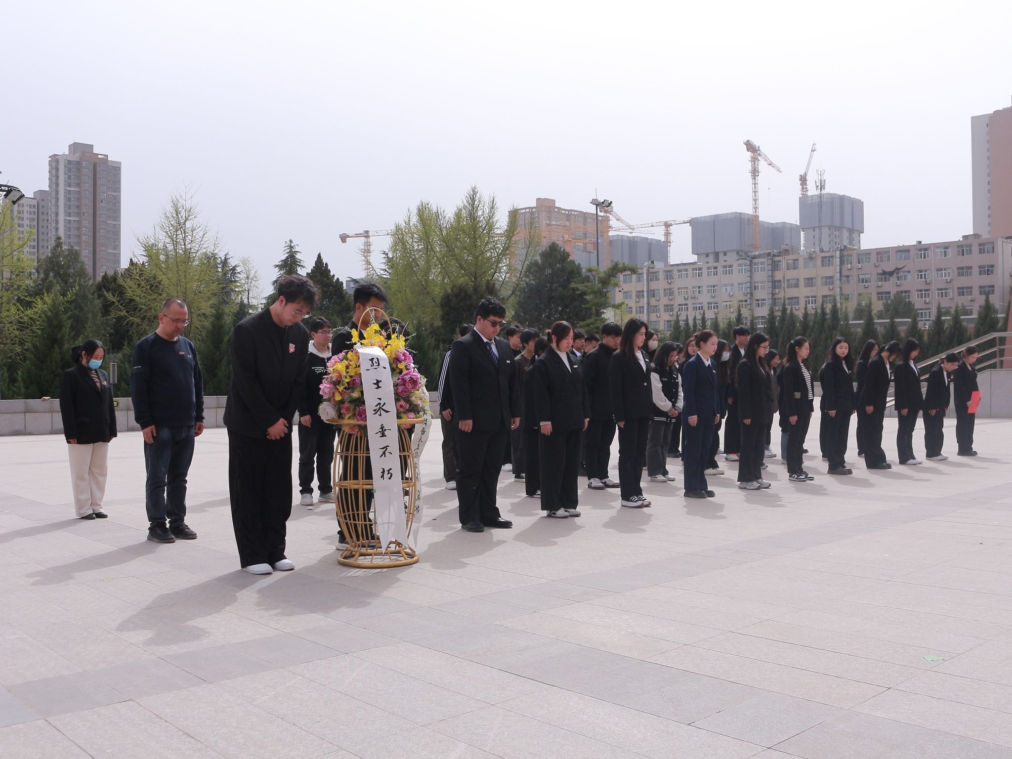 同学们给烈士献花以后,在陵园的广场上整齐列队。每个人身姿挺拔,面容凝重,在寂静的陵园中,唯有微风拂过树叶的沙沙声。随着一声庄重的指令,全体同学缓缓弯腰,行鞠躬礼。每一躬,都饱含着对英烈们的深切敬意与无尽感激,腰弯下的角度,是对先辈奉献的崇高致敬。