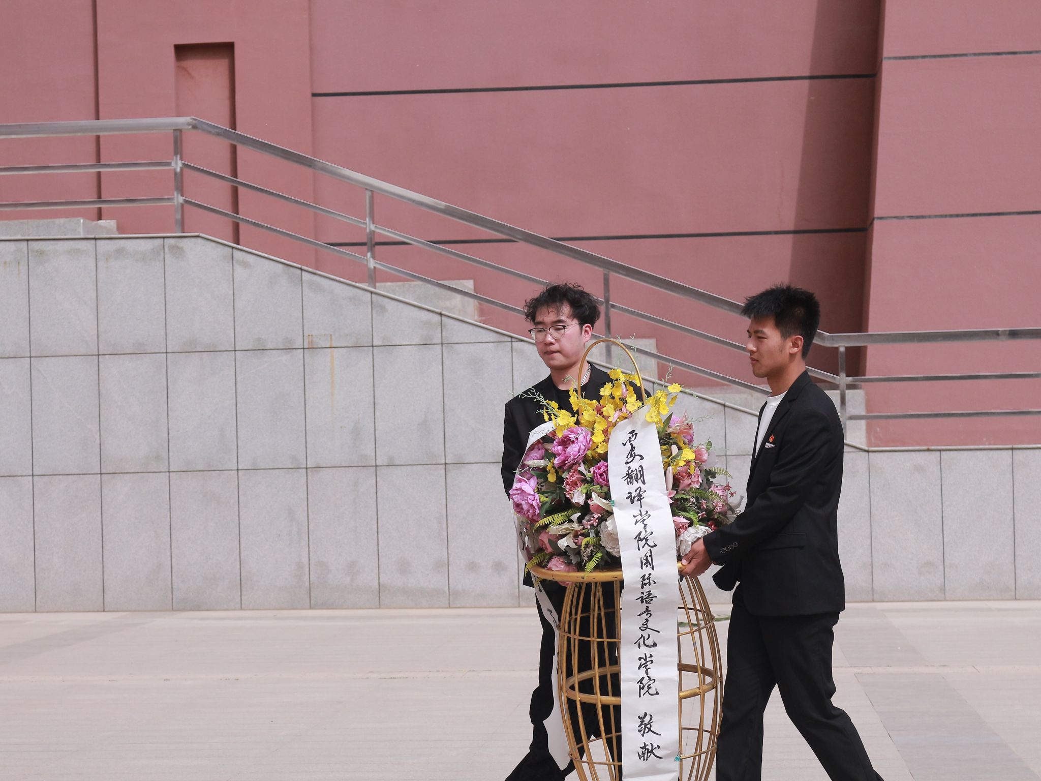 在这片空旷的广场上,四周静谧无声,唯有微风轻拂。两名同学神情庄重,身着整洁的正装,肩并肩稳步前行。他们手中紧握着精美的花篮,花篮里的鲜花娇艳欲滴,散发着淡淡的清香。走到广场中央,他们同时停下脚步,将花篮轻轻摆放好。挺直身躯后,他们目光坚定地注视着花篮,再缓缓转身归队。在这一刻,无声的敬意在空气中弥漫开来,仿佛英烈们用他们的精神在同学们心中矗立起一座不朽的精神丰碑。