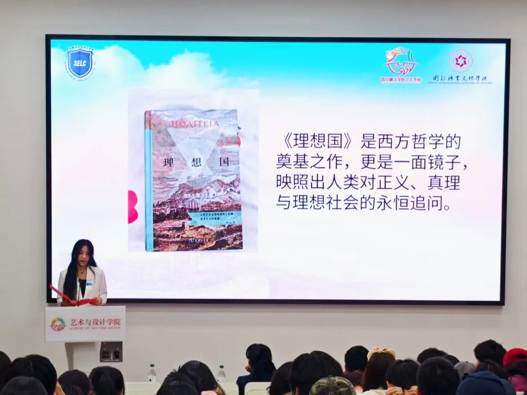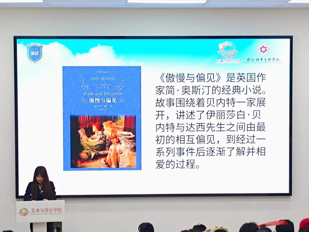 最后,英文学院学生会的张璐怡以一口流利的英语片段朗诵,为《傲慢与偏见》的分享增添别样风情。她巧妙分析书中人物的性格与爱情观,对比现代婚恋观念,用生动幽默的语言将简・奥斯汀笔下 19 世纪英国社会的风貌与人性百态展现得淋漓尽致。三位分享者各展所长,通过独特视角与深刻见解,带领同学们穿梭于不同时空与思想领域,现场掌声如潮,赞叹声此起彼伏,知识的魅力在热烈的氛围中尽情绽放。