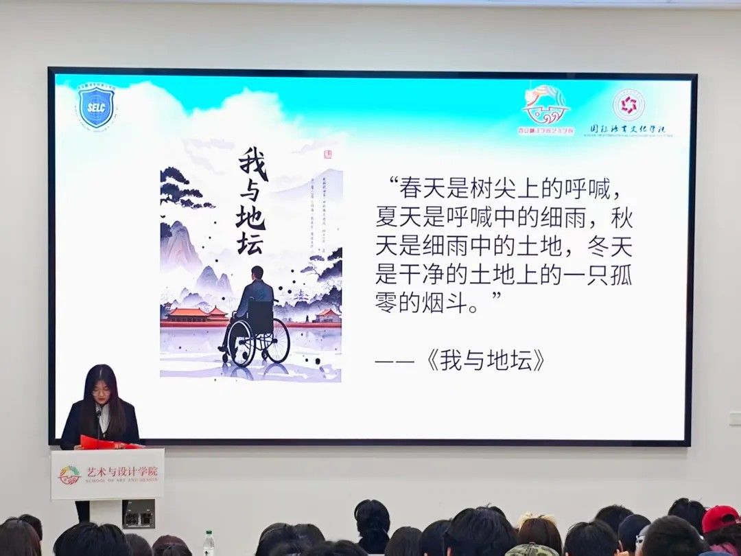紧接着,艺术与设计学院学生会的钟楚慧以温柔且坚定的语调,分享史铁生的《我与地坛》。她用细腻的笔触描绘书中地坛的四季更迭,将史铁生对生命的哲思娓娓道来,不仅讲述了作者与命运抗争的故事,更结合自身经历,探讨在挫折中如何找寻生命的意义,真挚的情感引发全场共鸣。