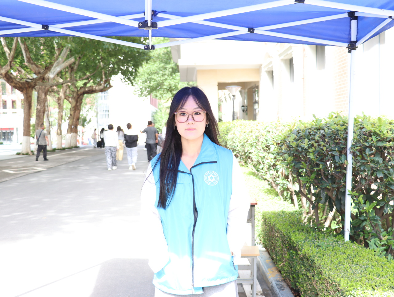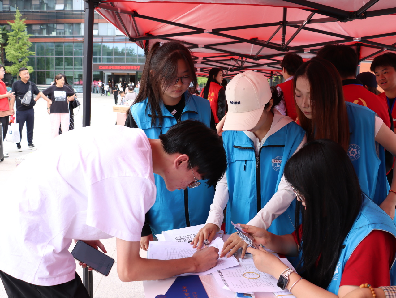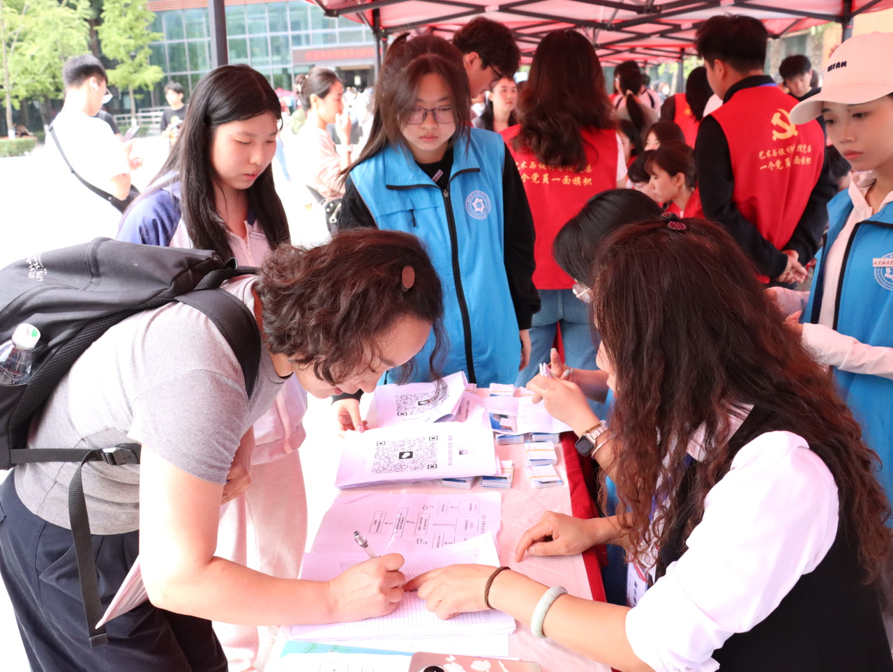 校园内随处可见身着志愿者服的学长学姐,他们沿着校门到报到点、宿舍区的关键路线定点值守,他们会主动上前引导方向,遇到携带大件行李的新生,会第一时间上前搭把手,帮着推送行李车,让新生无需在校园内盲目寻找,轻松抵达各个目的地。