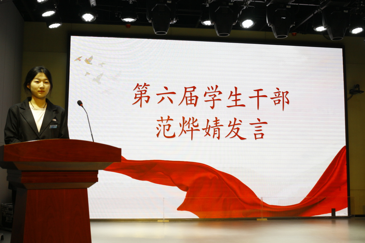 第六届学生干部范烨婧表示,立足这承载初心的舞台,心中满溢感恩与眷恋。过往一载,每段并肩奋进的时光皆为成长路上的珍贵印记,沉淀为前行的力量。由衷感谢老师们的悉心指导与倾心托付,感谢全体部员的热忱坚守与同心协力。任期虽至,但这份与学生会的羁绊永不褪色,这份服务同学的初心始终滚烫。坚信新一届团队定能赓续优良传统,以更昂扬的姿态创造更绚烂的未来。愿新成员们能在这片广阔舞台上,以担当诠释责任,以创新书写精彩,不负韶华、不负期许。最后,衷心祝愿老师们工作顺遂、万事胜意,同学们学有所成、逐梦远航,祝愿学生会在薪火相传中绽放更耀眼的光芒!
