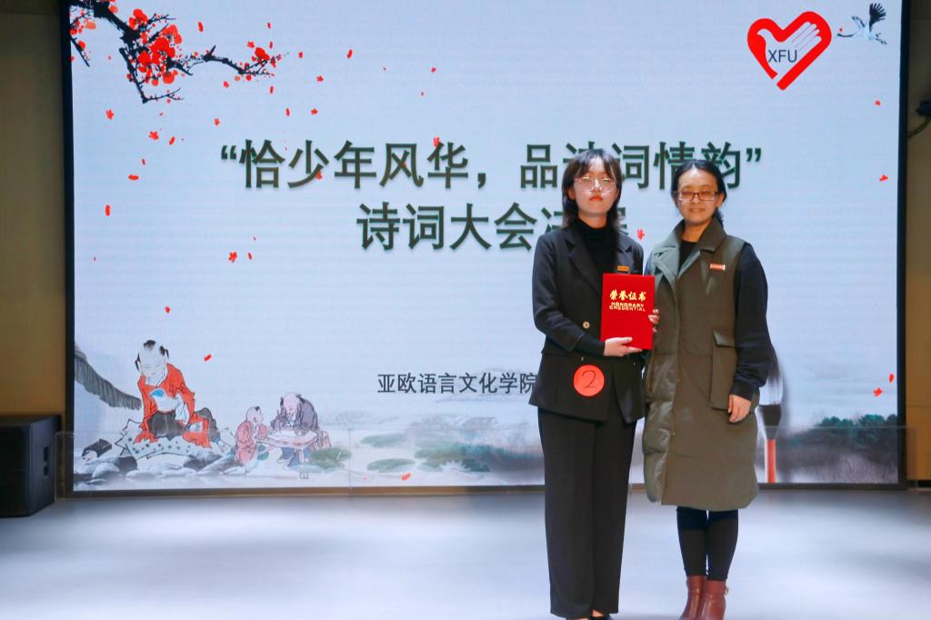 纵观历史,诗词文化传承千年,影响千年,与人相伴千年。唐诗宋词元曲等诗词文化是我国文化中不可或缺的部分,是中华文化之瑰宝,是我们精神的食粮。古人用“人生自古谁无死,留取丹心照汗青”表达对国家忠贞热爱的壮志豪情;用“海内存知己,天涯若比邻”表现友情;用“少壮不努力,老大徒伤悲”,表明要珍惜时光。古人用诗词传达着他们的情感诗词中蕴含着他们的感受,诸如此类的诗词传承至今,并为世人所引用。为此,亚欧语言文化学院青年志愿协会举办了以“恰少年风华,品诗词情韵”为主题的诗词大会比赛。