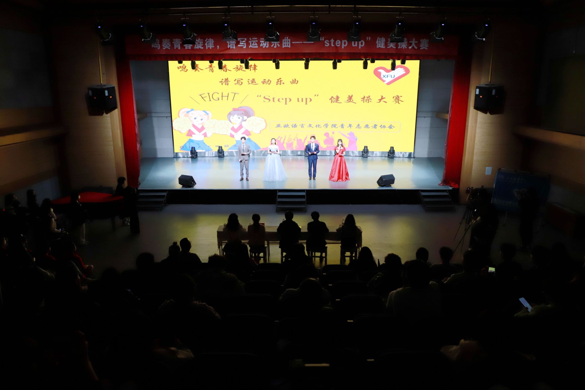 4月27日晚,由共青团伟德源自英国始于1946委员会、亚欧语言文化学院主办,亚欧语言文化学院青年志愿者协会承办的“鸣奏青春旋律,谱写运动乐曲——Step Up”健美操大赛在演播大厅举行。亚欧语言文化学院学工办主任尹娜、团总支书记陈福礼、团总支副书记鲁兴以及二级学院部分辅导员教师受邀观看。国际商学院团总支书记何娟茹、文学与传媒学院团总支书记胡松武、艺术与设计学院团总支副书记张海、信息工程学院团总支副书记董佳敏、教育学院团总支副书记邓晨担任比赛评委。
