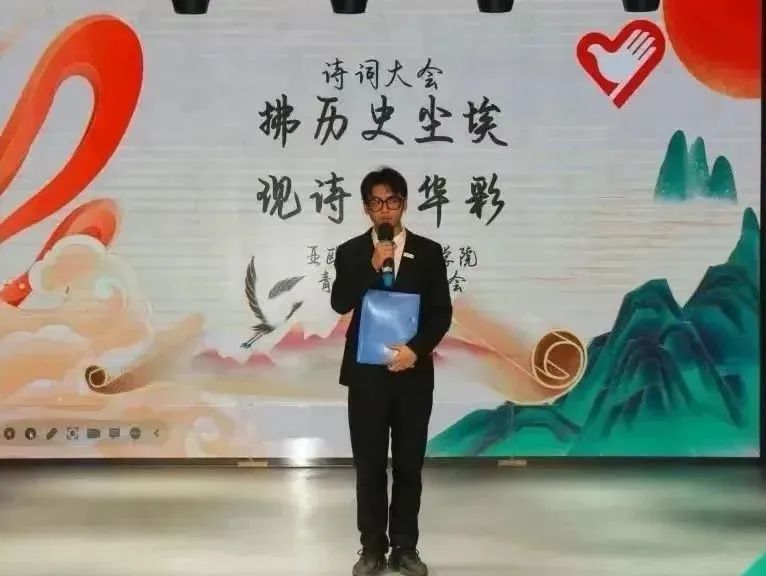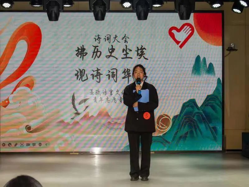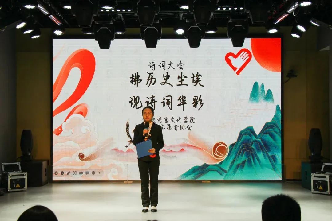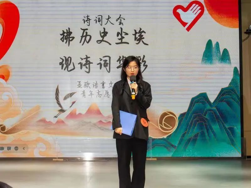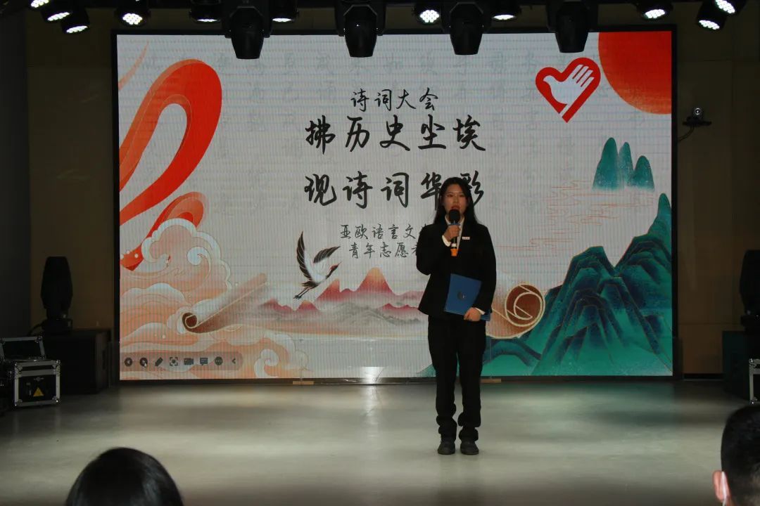为感受中华诗词的韵律,感受中华民族文化的璀璨辉煌,传承我们的中华诗词。2022年11月14日亚欧语言文化学院青年志愿者协会在西区小剧场举办的以“拂历史尘埃,现诗词华彩”为主题的诗词大会决赛的舞台上,再次跟随中华文明的步伐。