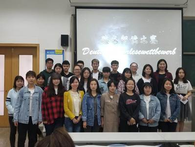 4月25日15:40,亚欧语言文化学院西方语系德语专业第一届德语朗诵比赛在5117T教室成功举行。来此2017级总计17名选手参加了此次比赛,2017级全体同学观看了本次比赛。卞红联、刘灵珊、刘庆三位德语教师担任比赛评委。
