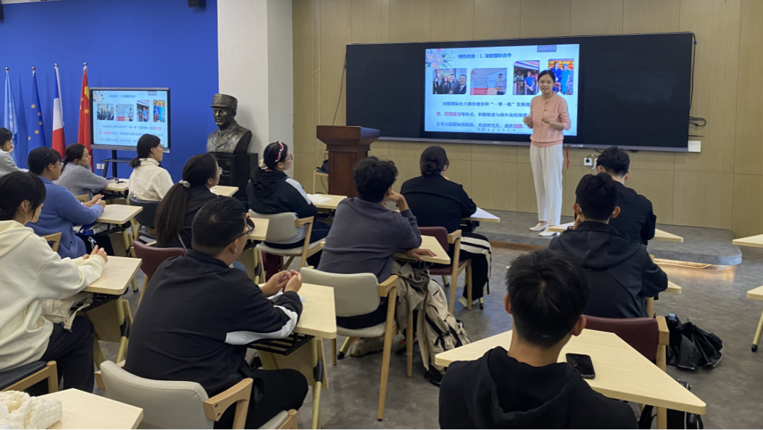 10月17日,亚欧语言文化学院法语系在法国文化体验馆开展2023级法语专业第一堂新生教育课。法语系主任王姗姗从学校人才培养模式、学院特色、法语专业发展、历史沿袭、专业人才培养方案、毕业条件及专业特色与亮点等方面进行介绍。