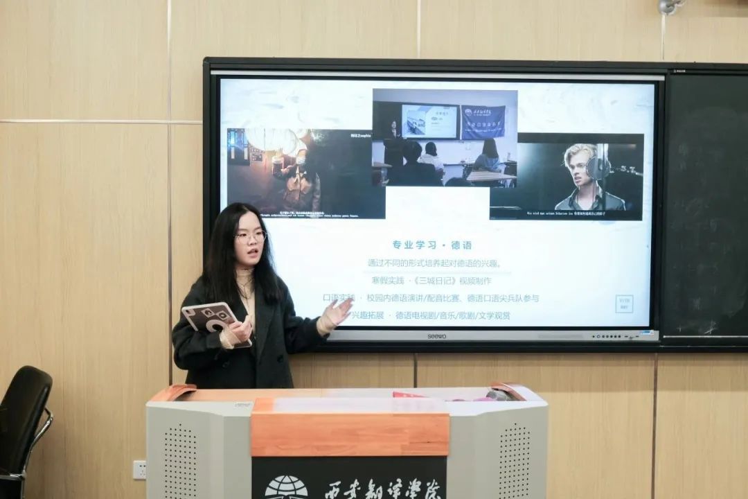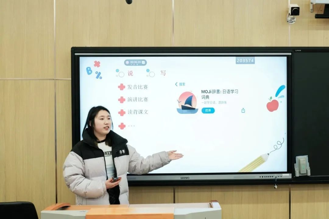 日语专业的七位同学,分享了他们在设置明确的学习目标、定制学习计划、培养语感与建立自信等方面的学习方法,同时告诉大家要以百倍信心和万分努力去迎接挑战,用持之以恒的耕耘去谱写更好的未来。此外,王海岩将专业课的学习方法细分为单词、口语、听力三部分给新生们提供参考,倡导同学们从中发现选择最适合自己的学习方法。